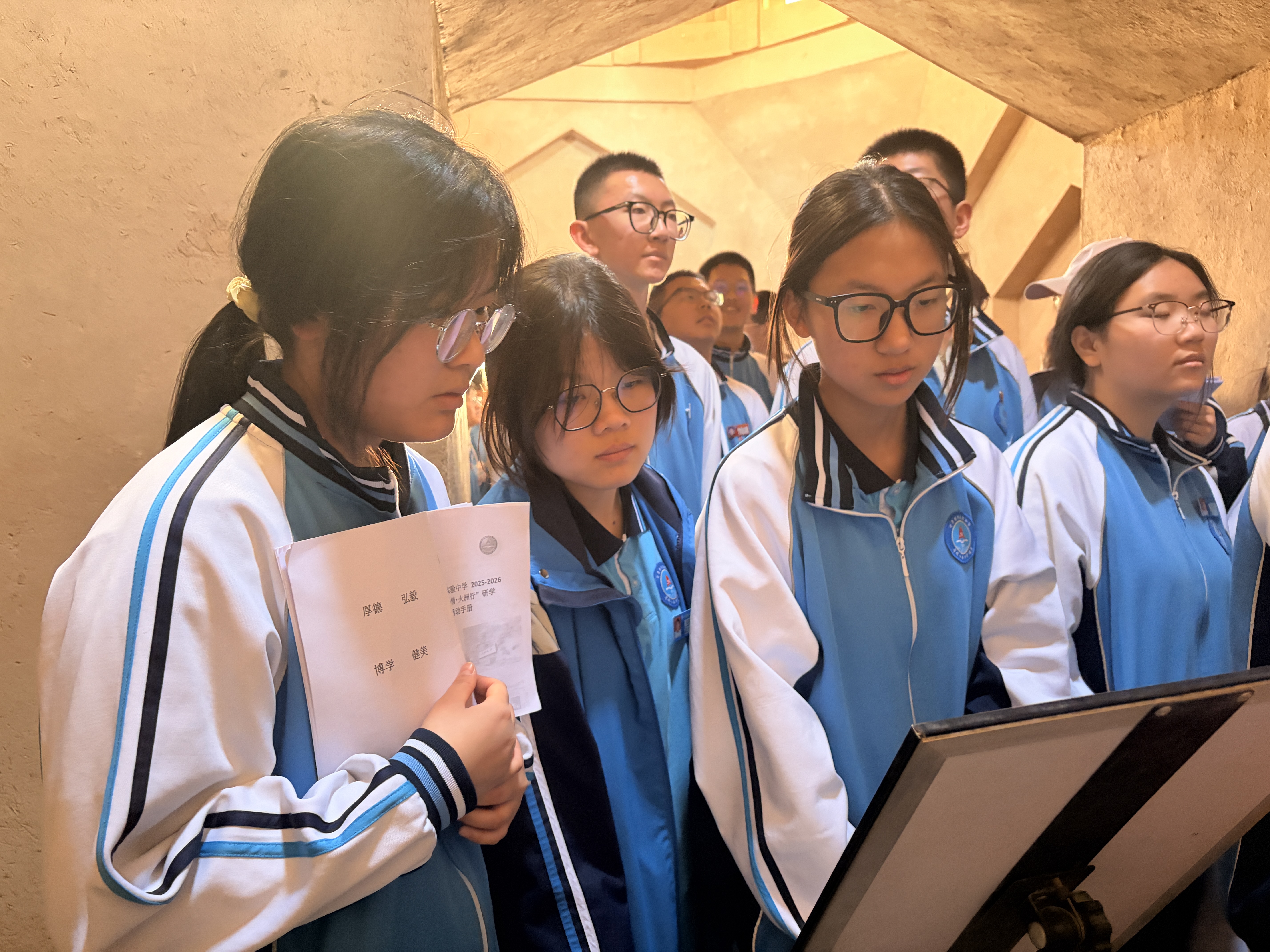 研学期间,师生们先后走进柏孜克里克千佛洞、苏公塔、坎儿井民俗园、交河故城景区,沉浸式触摸丝路文明脉络。在柏孜克里克千佛洞,大家驻足观赏精美壁画,感受多元文化交融共生的悠远历史脉络;在苏公塔下,师生们认真聆听建筑背后的民族团结故事,深刻体悟各民族休戚与共、命运与共的深厚情谊;在坎儿井民俗园,师生们深入了解各族人民同心协力修建水利工程的奋斗历程,还参与坎儿井模型搭建,在实践体验中感受劳动的乐趣;在交河故城,大家漫步千年遗迹之上,探寻古丝绸之路的文明足迹。