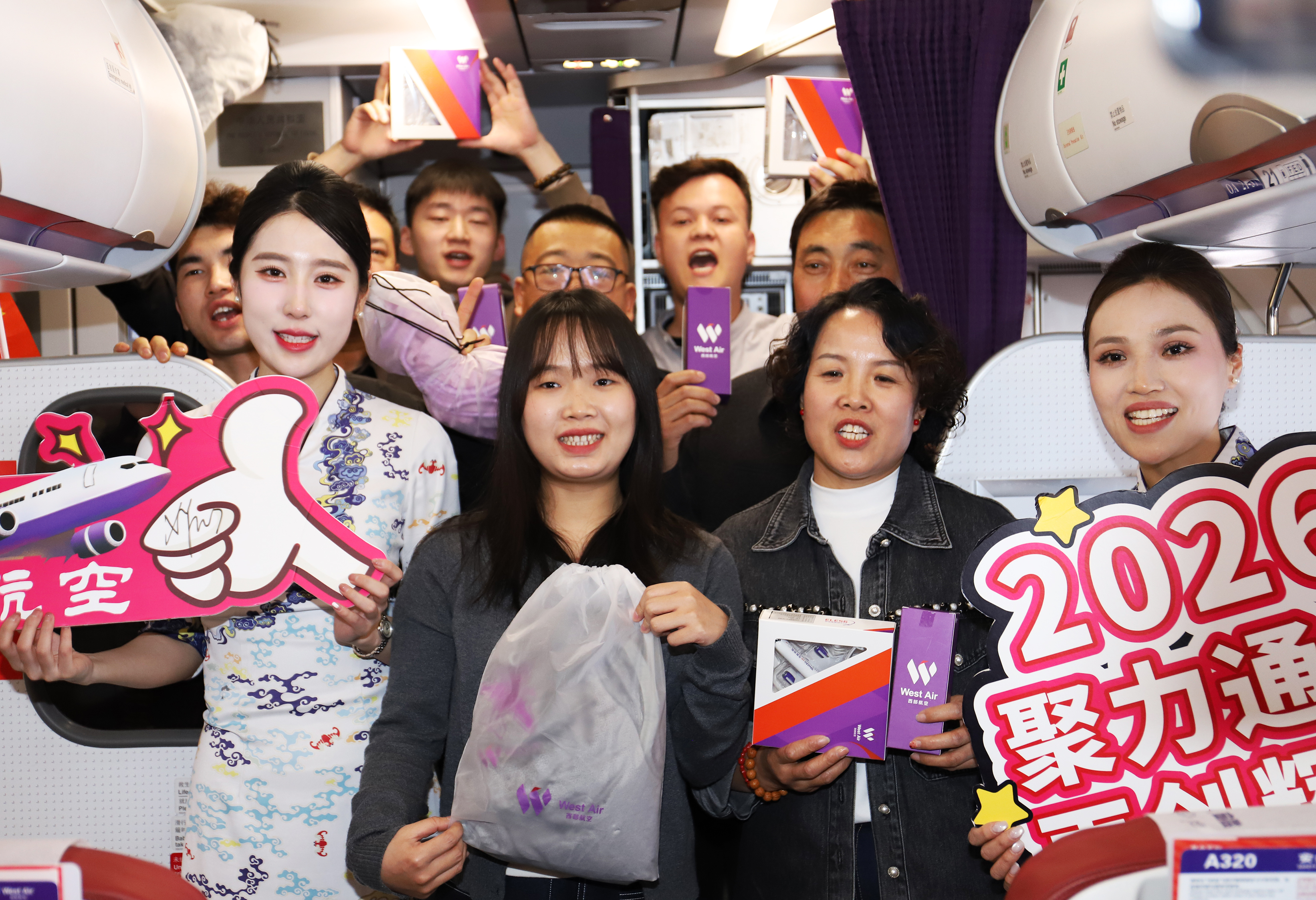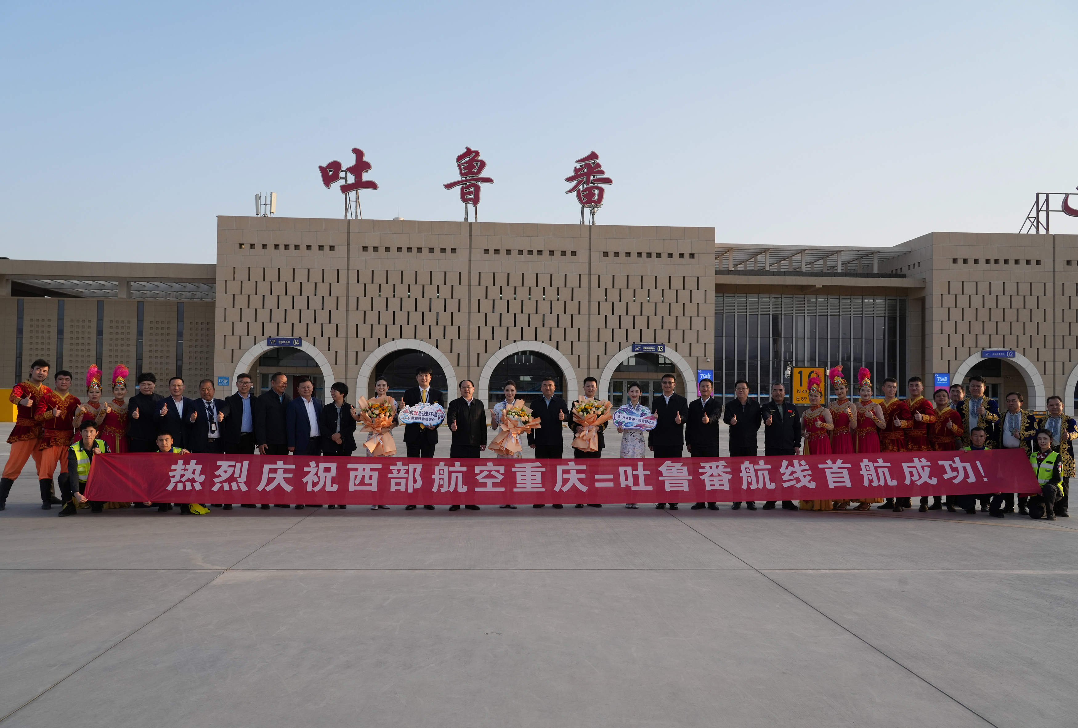 西部航空重庆——吐鲁番航线首航成功。机组工作人员与乘客合影留念。吐鲁番市融媒体中心记者 刘字昂 摄