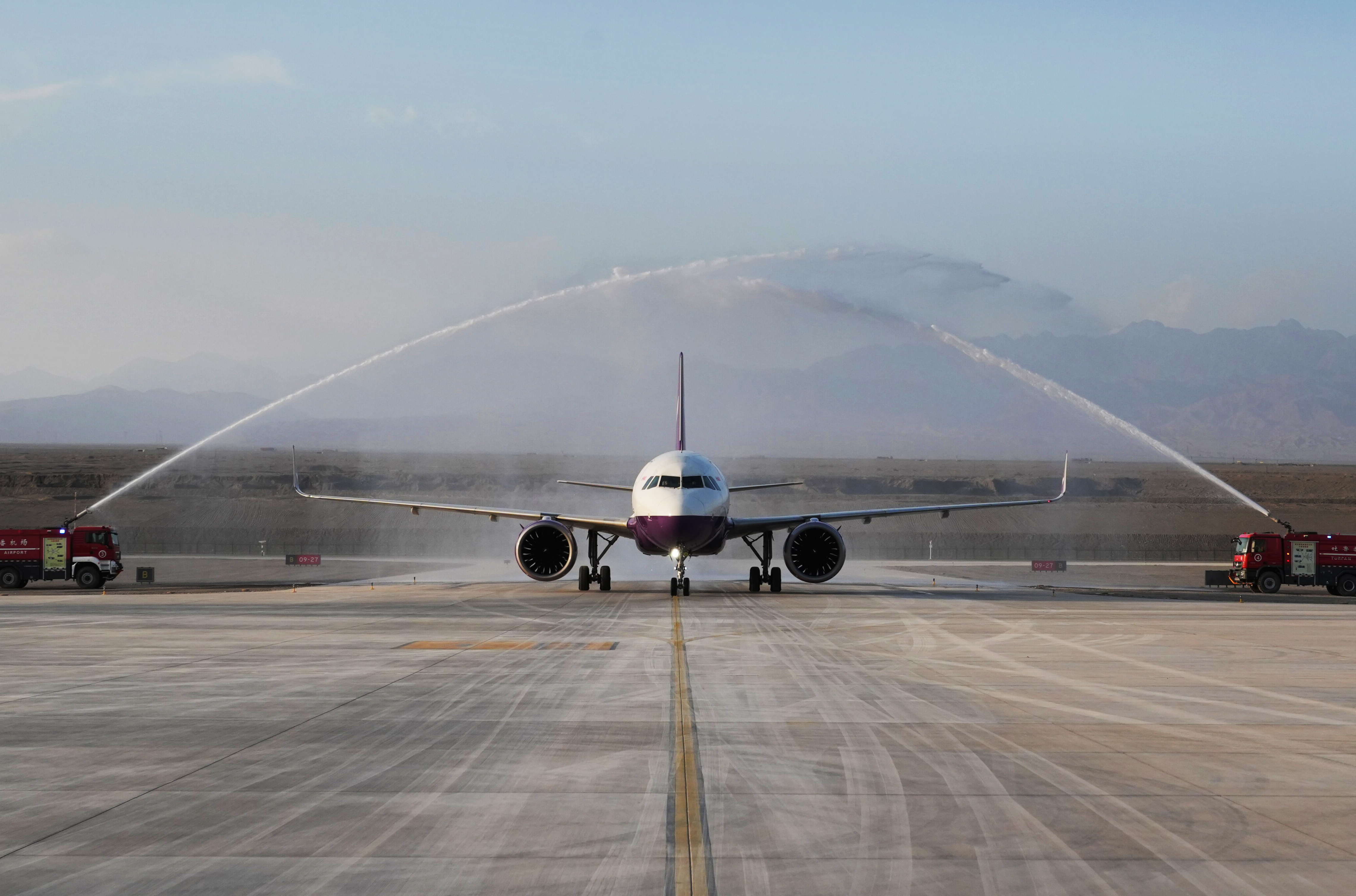 重庆——吐鲁番航线首航成功。吐鲁番交河机场以民航最高礼仪“过水门”迎接飞机成功抵达。吐鲁番市融媒体中心记者 刘字昂 摄