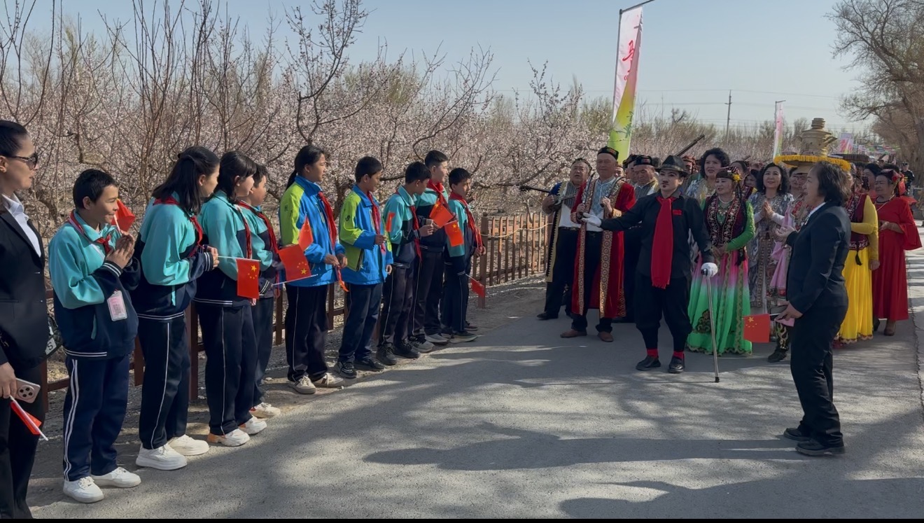开园仪式上,歌舞《杏花园里的喜乐巴扎》活力四射,舞蹈《纳孜库姆》以诙谐灵动的舞步引得师生连连欢呼。杏花园内,开斯克尔学校师生漫步杏林,带队教师沿途讲解杏花生长知识与民俗文化,并带领学生观看趣味斗鸡比赛,让自然与民俗在实景中鲜活呈现。