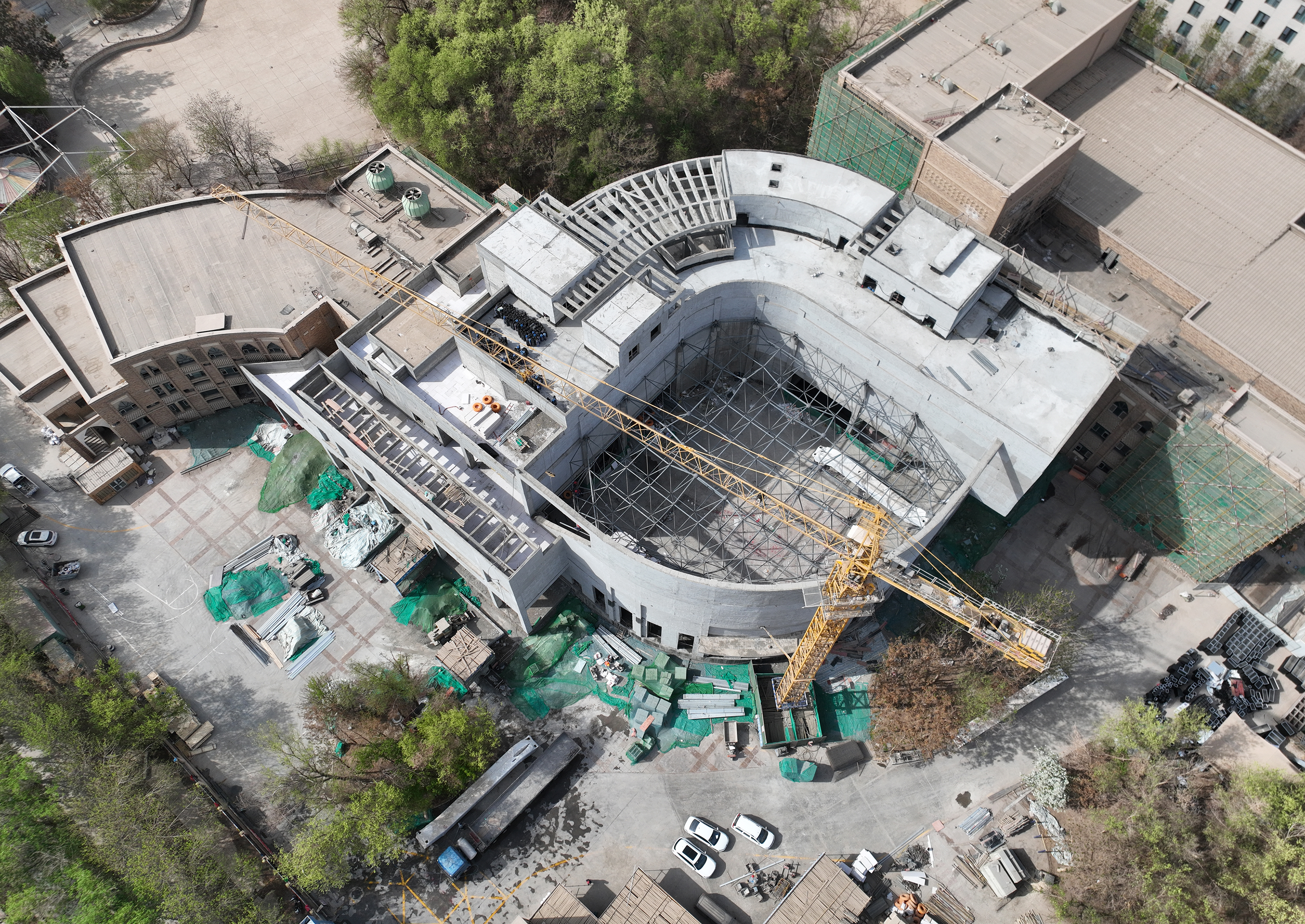 吐鲁番市融媒体中心讯(记者 刘字昂 木塔力甫)4月1日,记者在吐鲁番博物馆二期改扩建项目施工现场看到,工人们正有序进行屋面球形网架安装、墙面刮白及钢结构防火涂料喷涂作业。该项目预计于今年国庆节前建成并对外开放。
