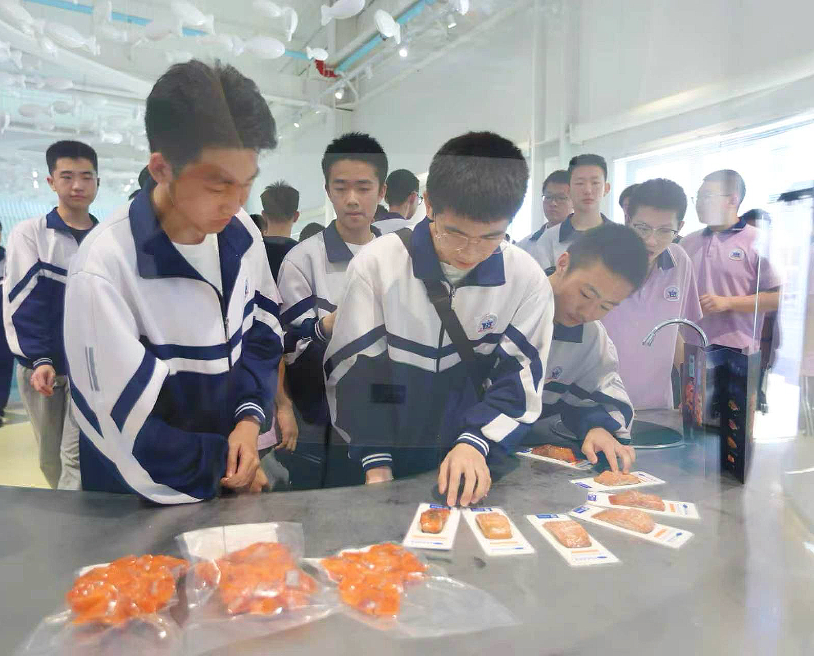 在粤新绿色(新疆)能源集团有限公司,研学团参观了风电生产线、观摩叶片制造、学习装备制造知识;走进冷泉三文鱼养殖基地,探访循环水养殖池,了解养殖、加工与冷链体系。一路上,学生们目不转睛、兴致盎然,近距离感受风力发电的工作原理,品尝冰鲜三文鱼的鲜嫩与清甜。