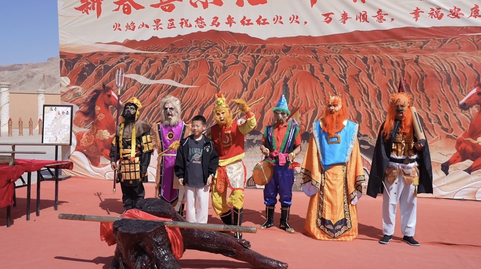 游客沉浸式体验火焰山景区“小妖巡山”后,和西游主题npc合影。高昌区融媒体中心供图。