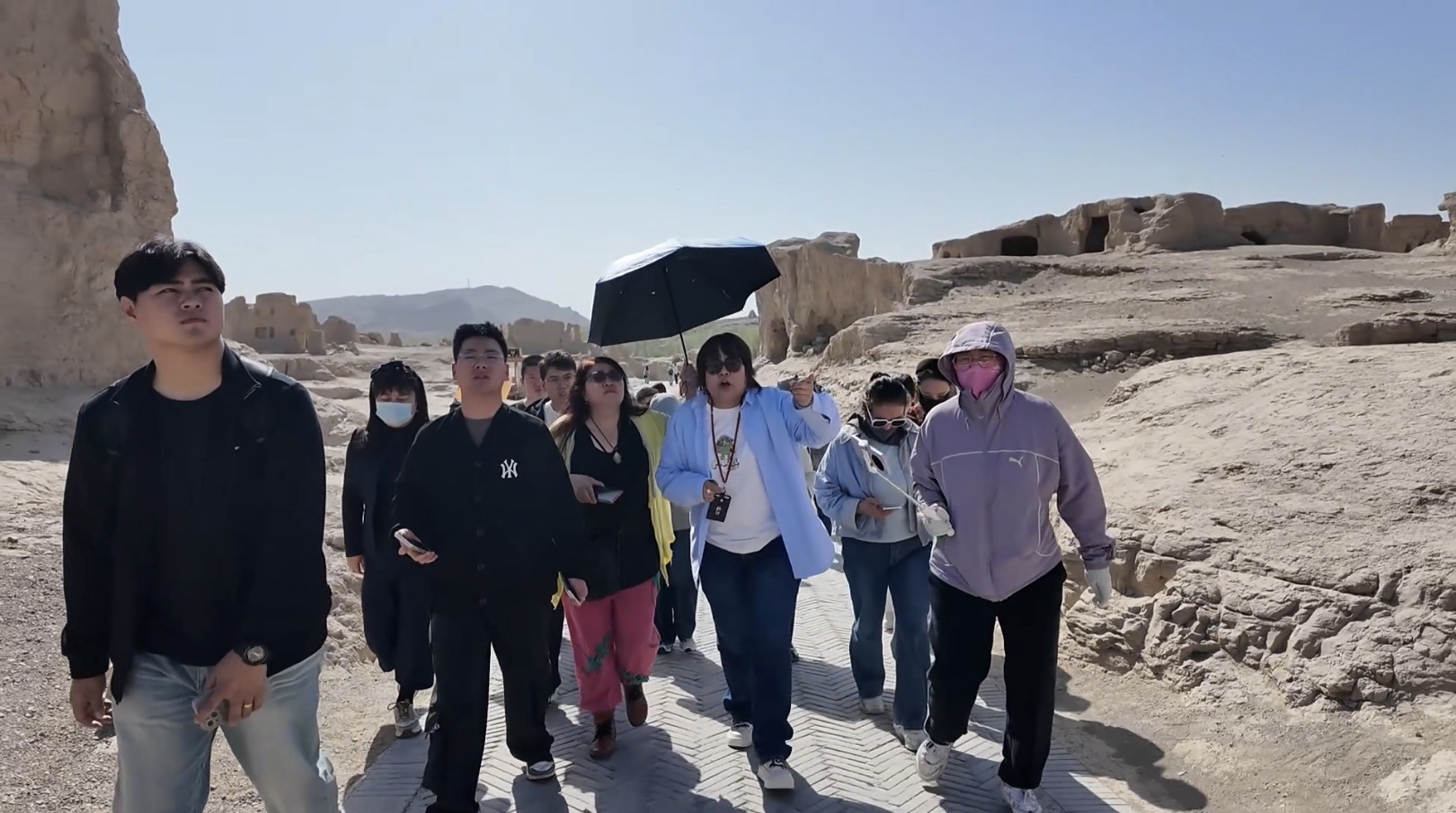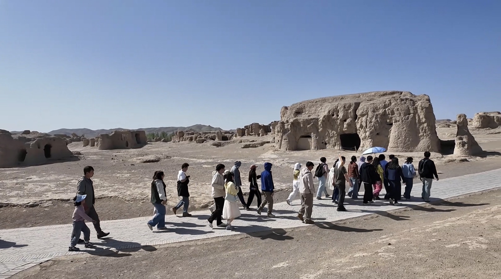 游客跟随讲解员细细品味交河故城厚重的历史。高昌区融媒体中心 供图