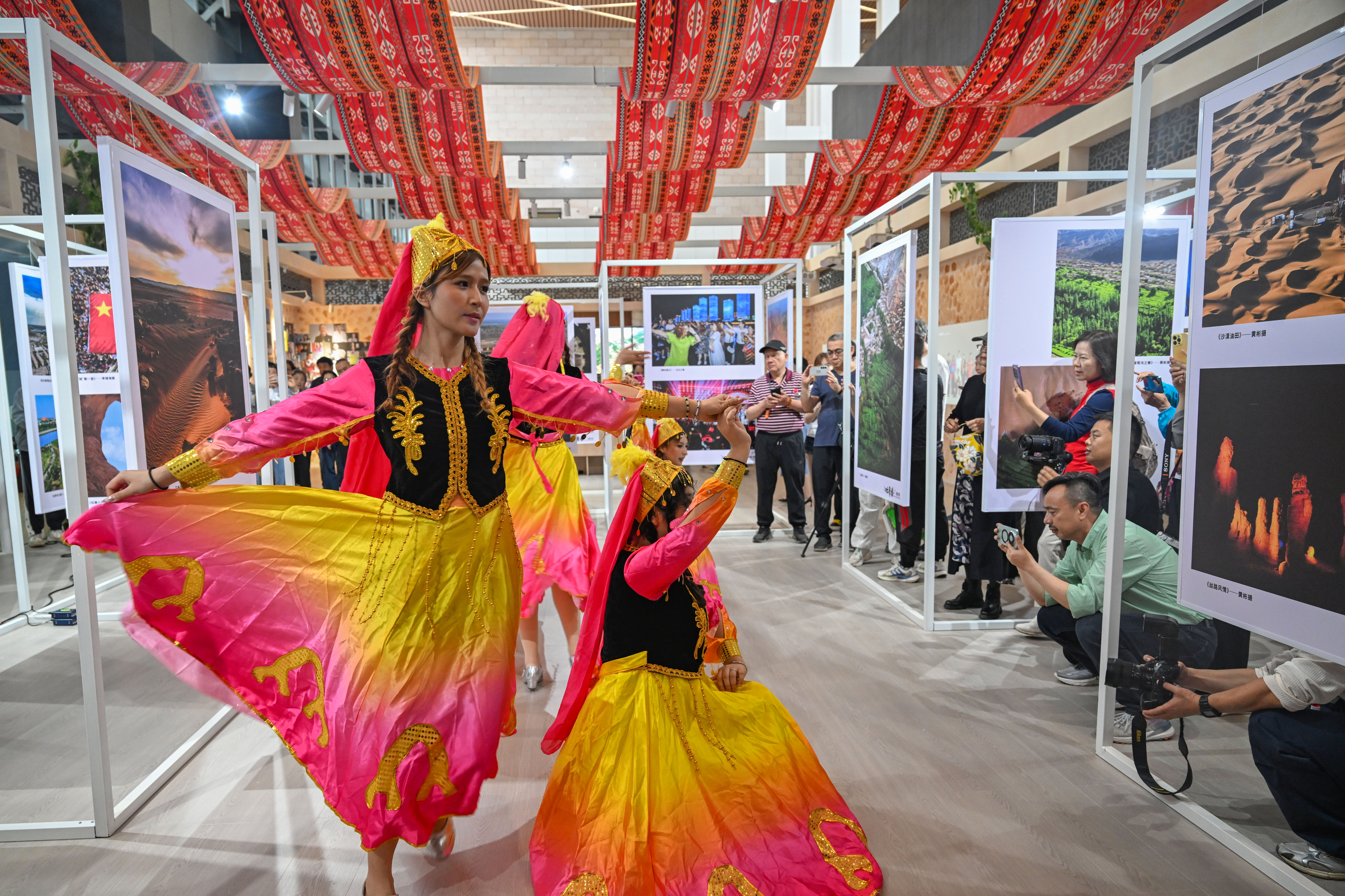 4月9日,在湖南省博物馆“我的吐鲁番”摄影展现场,精彩的歌舞表演让观众在光影之外,沉浸式感受吐鲁番的热情与活力。 湖南日报全媒体记者 郭立亮 摄