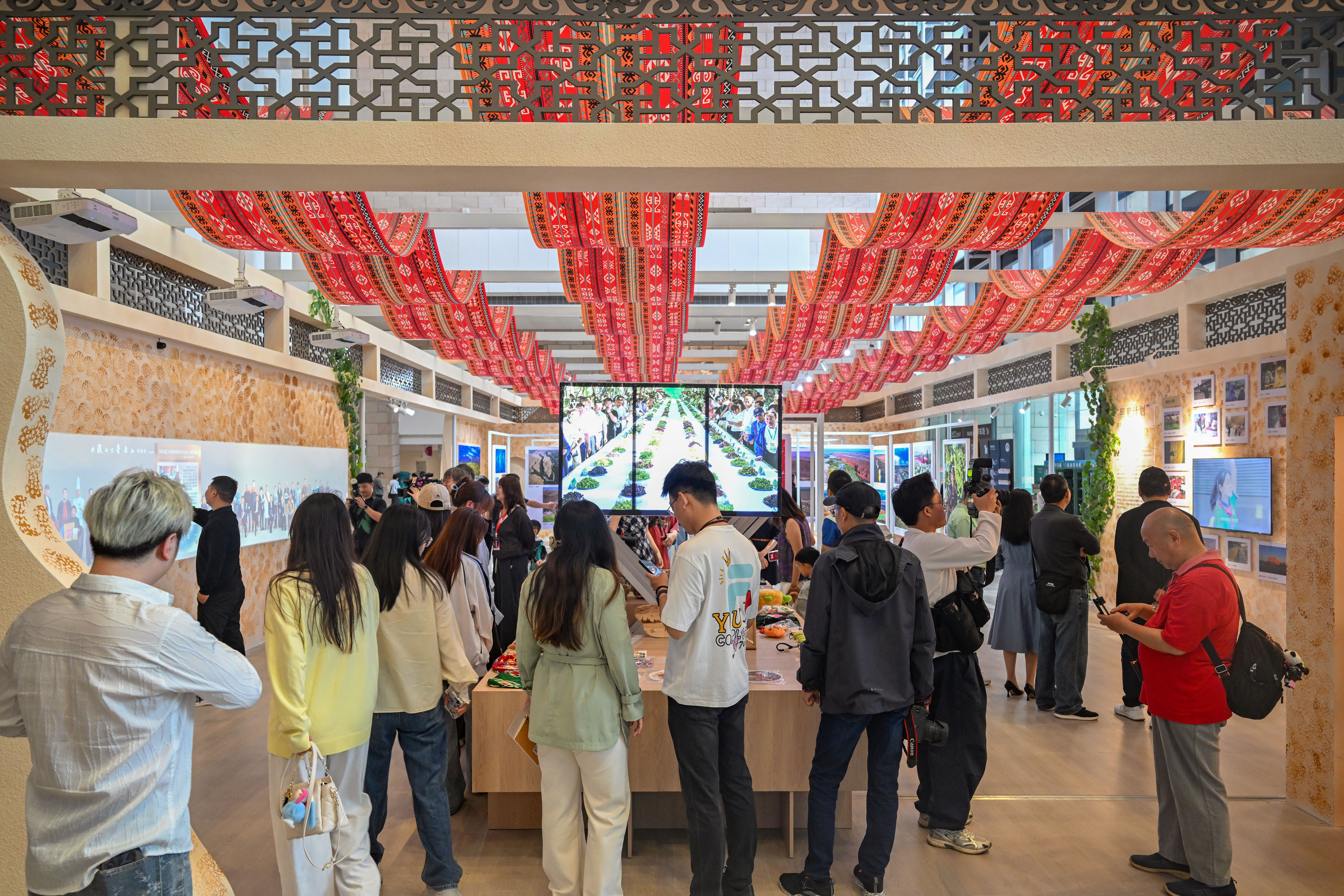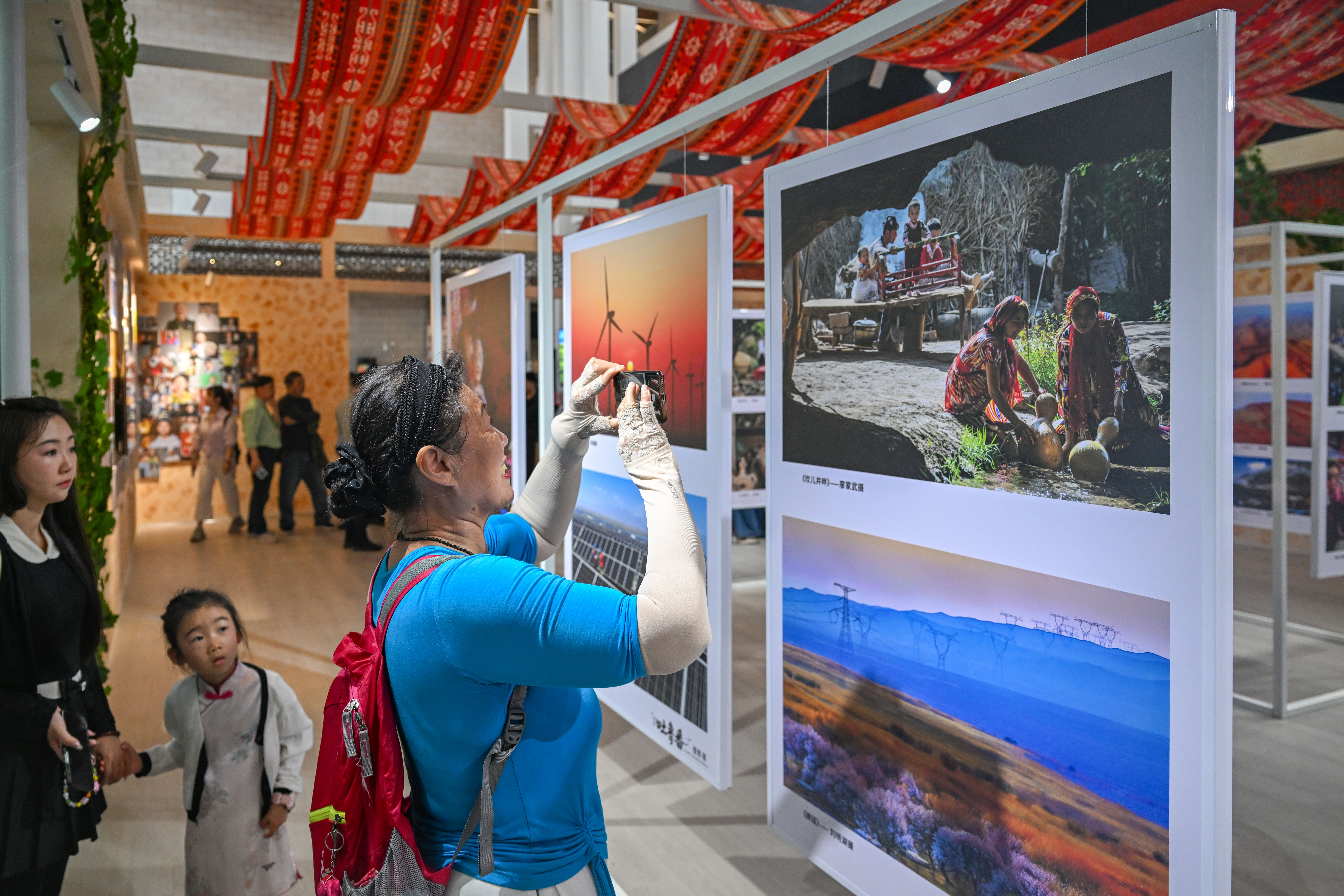 摄影展将该栏目文字、图片、视频、海报等素材全方位整合融入互动区域,现场设置了平台联动二维码,实现“线下观展+线上延伸”的双重传播,让观展者在感受摄影魅力的同时,直观感受各民族共同奋斗的生动画面。另一侧的互动区域,观众能切换吐鲁番特色背景,一秒“身到”吐鲁番,沉浸式感受火洲独特魅力,为当地文旅融合发展注入新活力。