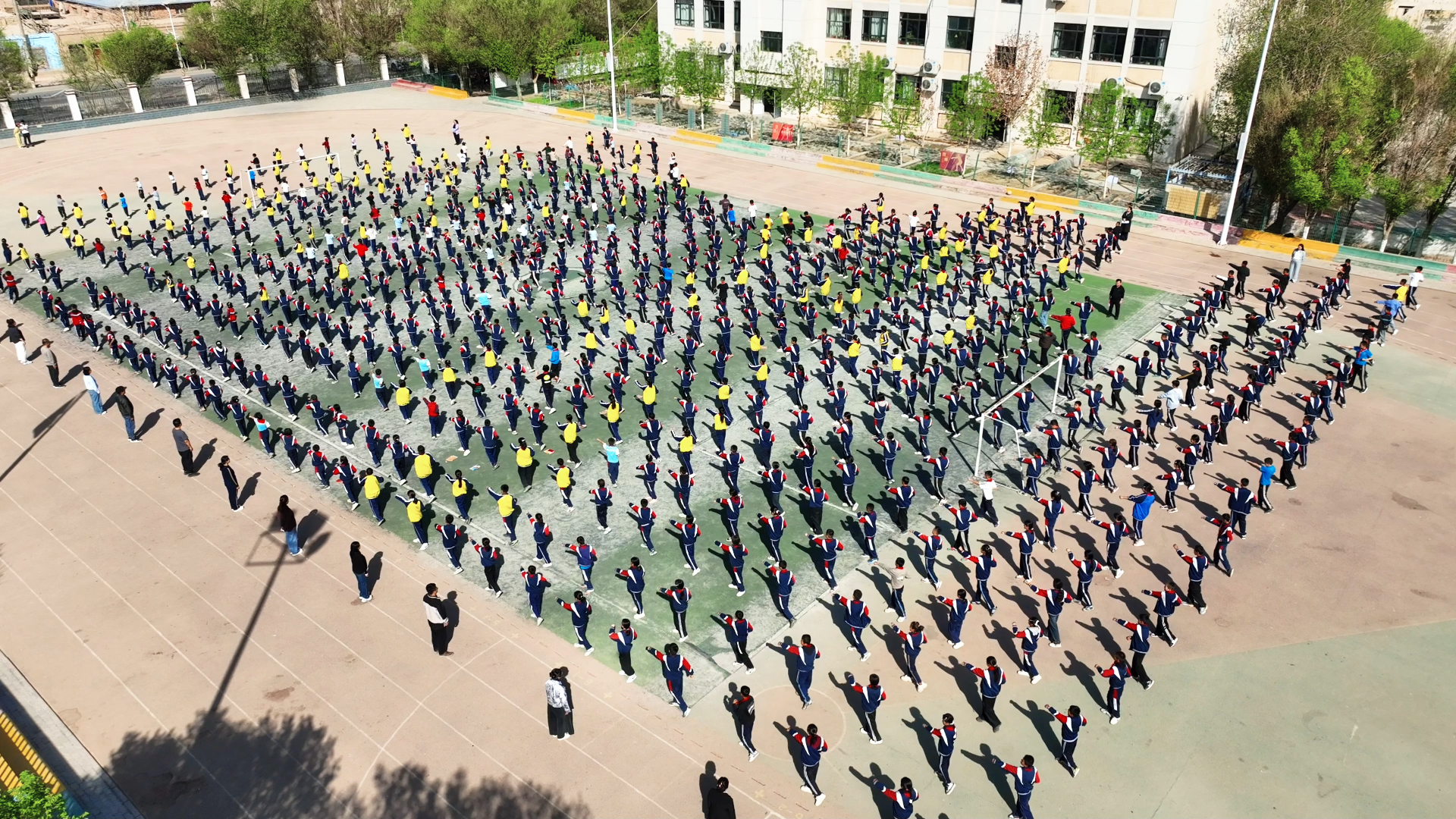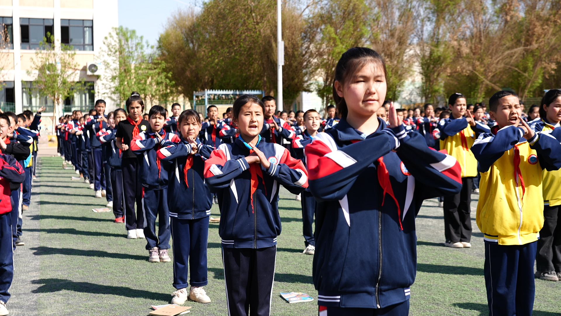 4月3日,高昌区中海集团艾丁湖希望小学的操场上,大课间活动如期而至。全校学生身着整齐校服,列队而立,伴随《弟子规》的诵读声,出拳刚劲、踢腿有力,气势如虹。