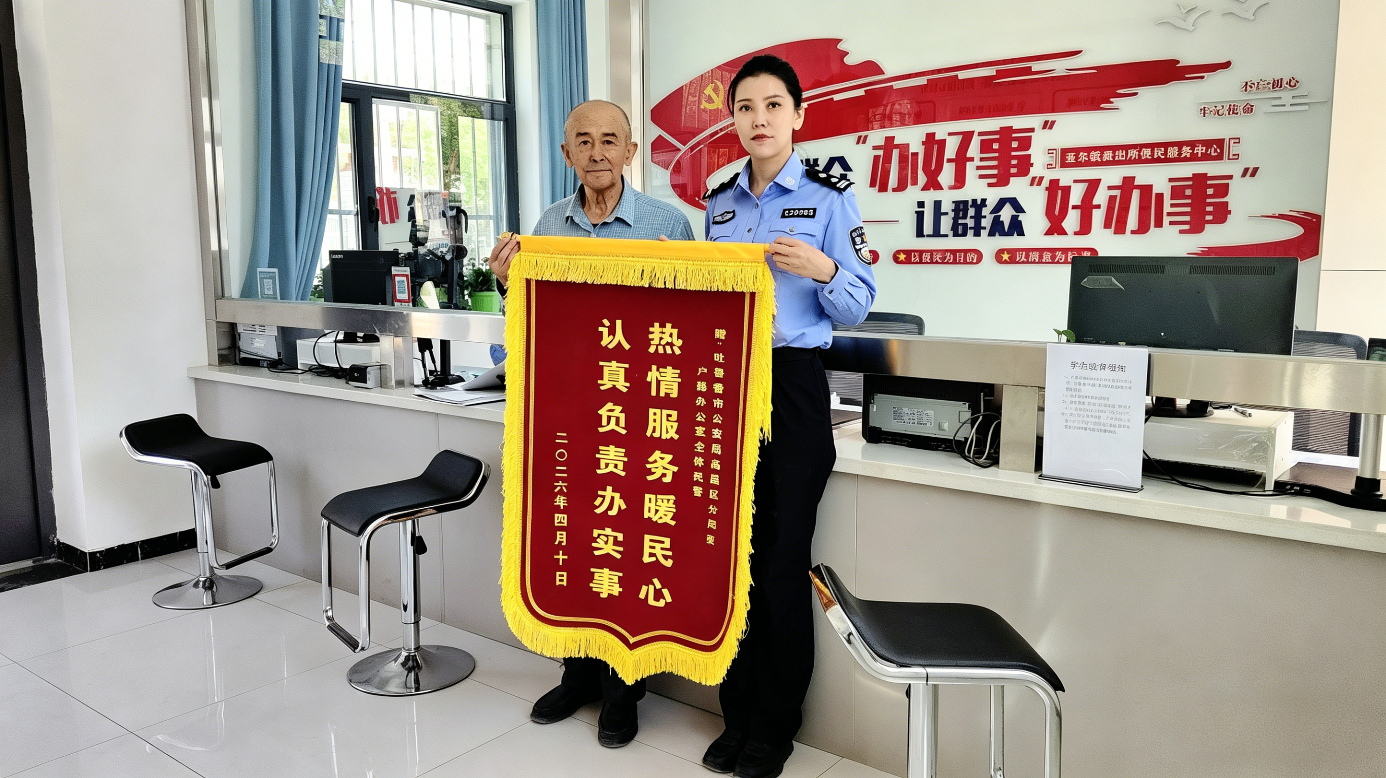 4月10日,克然木专程来到吐鲁番市公安局高昌区分局亚尔镇派出所,将一面写有“热情服务暖民心 认真负责办实事”的锦旗送到民警手中,感谢民警在非工作时间帮他顺利办妥了户籍业务。这是亚尔镇派出所近年来收到的多面锦旗之一,每一面背后都是一段为民办实事的暖心故事。