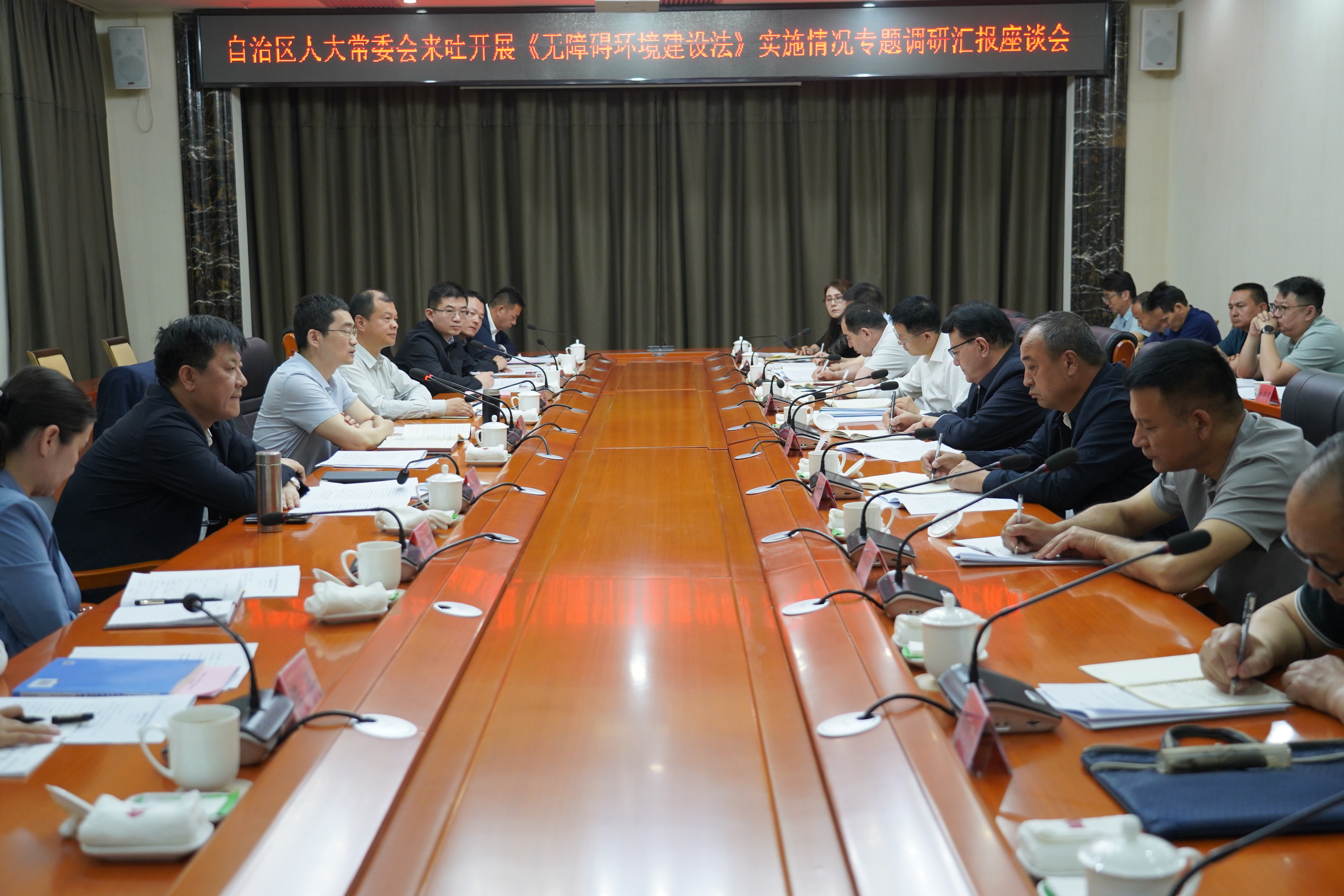 座谈会上,吐鲁番市人民政府分管领导就全市《中华人民共和国无障碍环境建设法》实施工作作全面汇报。市卫健委、住建局、民政局、检察院、残联、文旅局、教育局、交通局、工信局等相关部门依次作补充发言,交流工作经验,并现场回应调研组提问。老年人、残疾人代表结合自身生活实际,围绕无障碍设施维护、出行便捷度提升、便民服务精准化推进等方面,提出了切实可行的意见建议。调研组成员结合实地调研情况,针对性地提出工作改进思路与举措。
