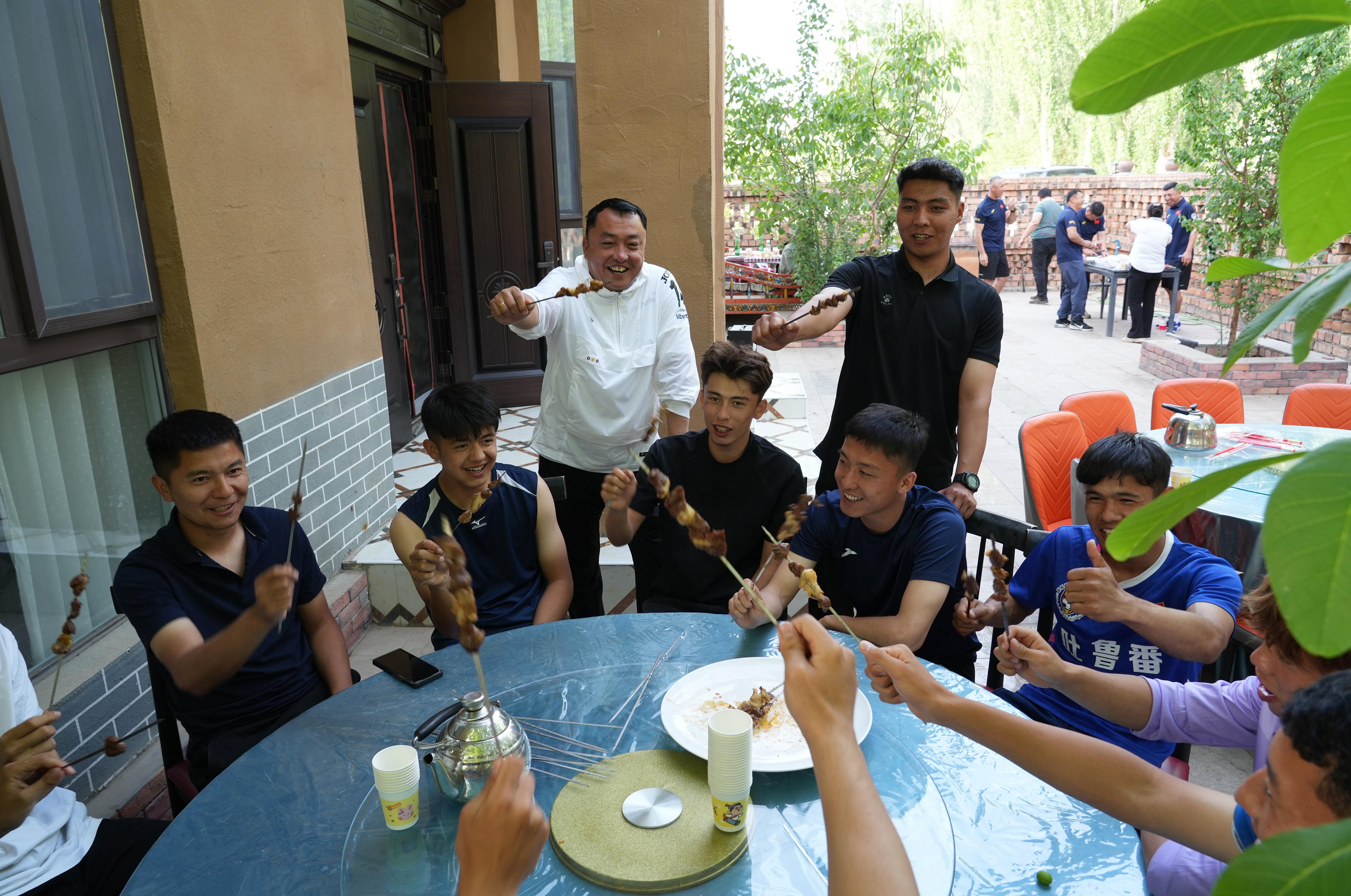 球员们为吐鲁番黑羊肉点赞。吐鲁番市融媒体中心记者 刘字昂 摄