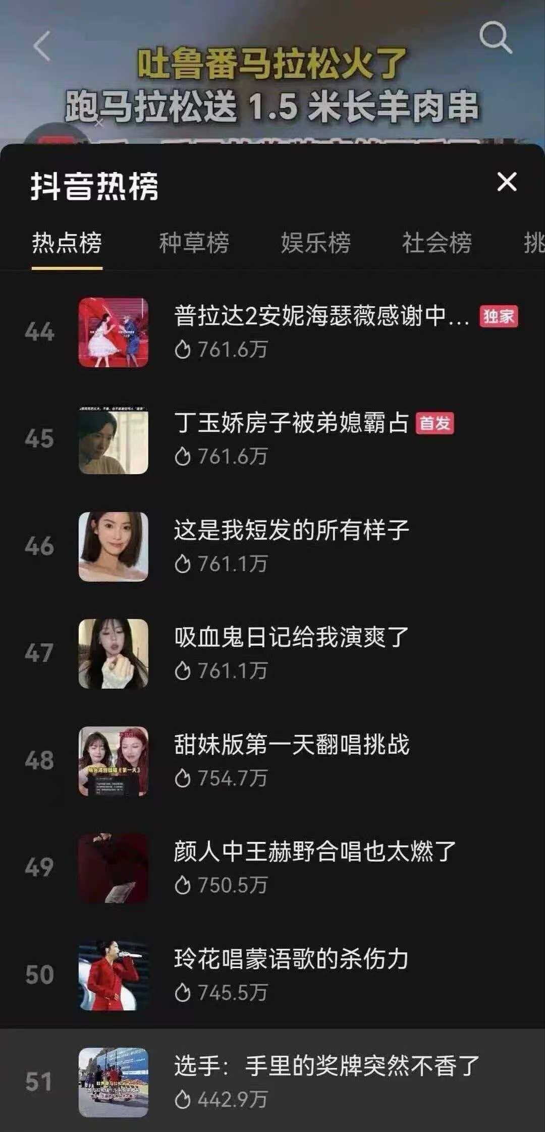 吐鲁番马拉松1.5米羊肉串登上抖音热榜。(来源:网络截图)