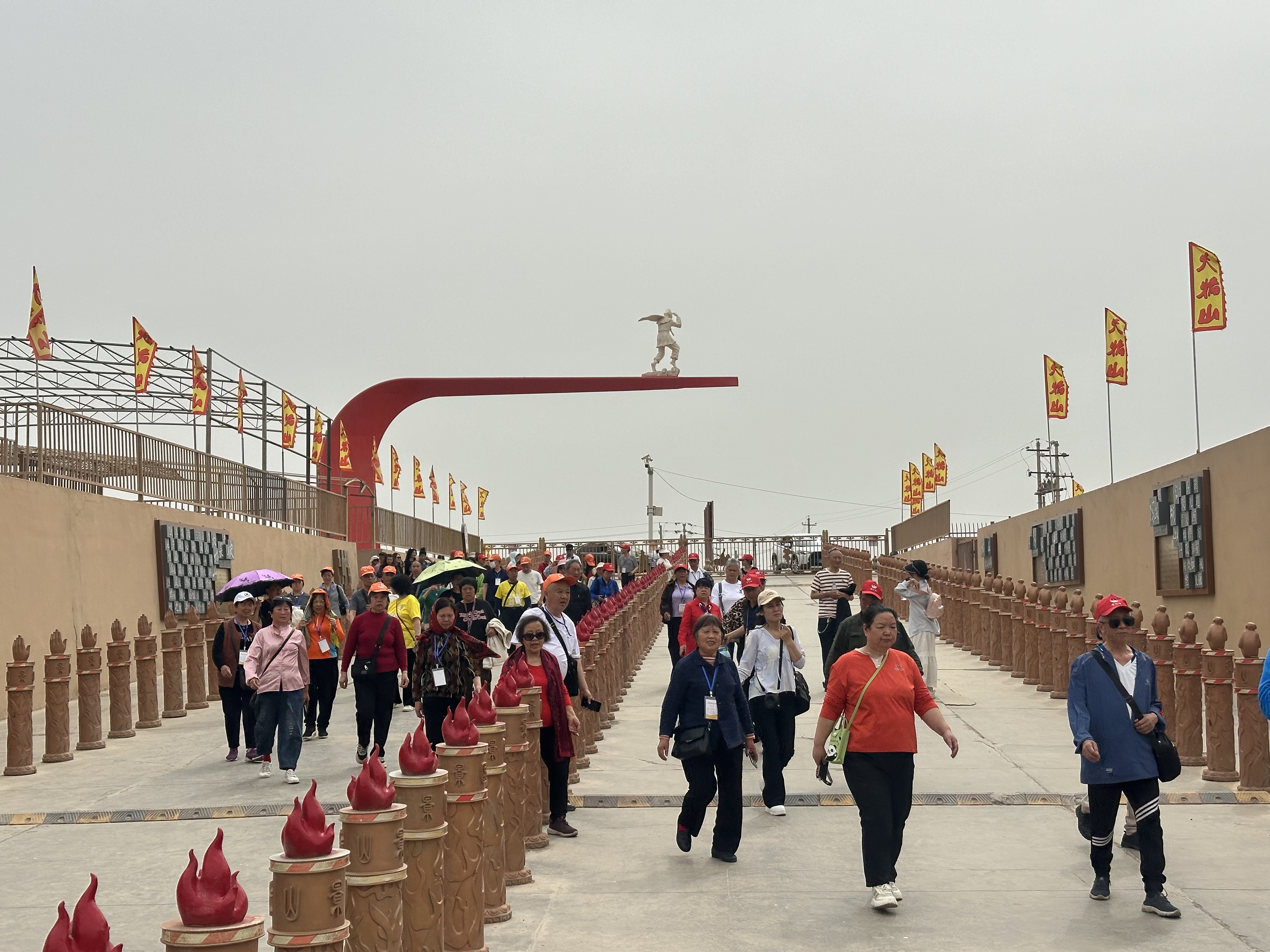 游客首站走进火焰山景区,赤红如焰的山体连绵起伏,游客们漫步其间,仰望壮阔地貌,并在西游文化主题IP景观前拍照留念,定格旅途美好瞬间。
