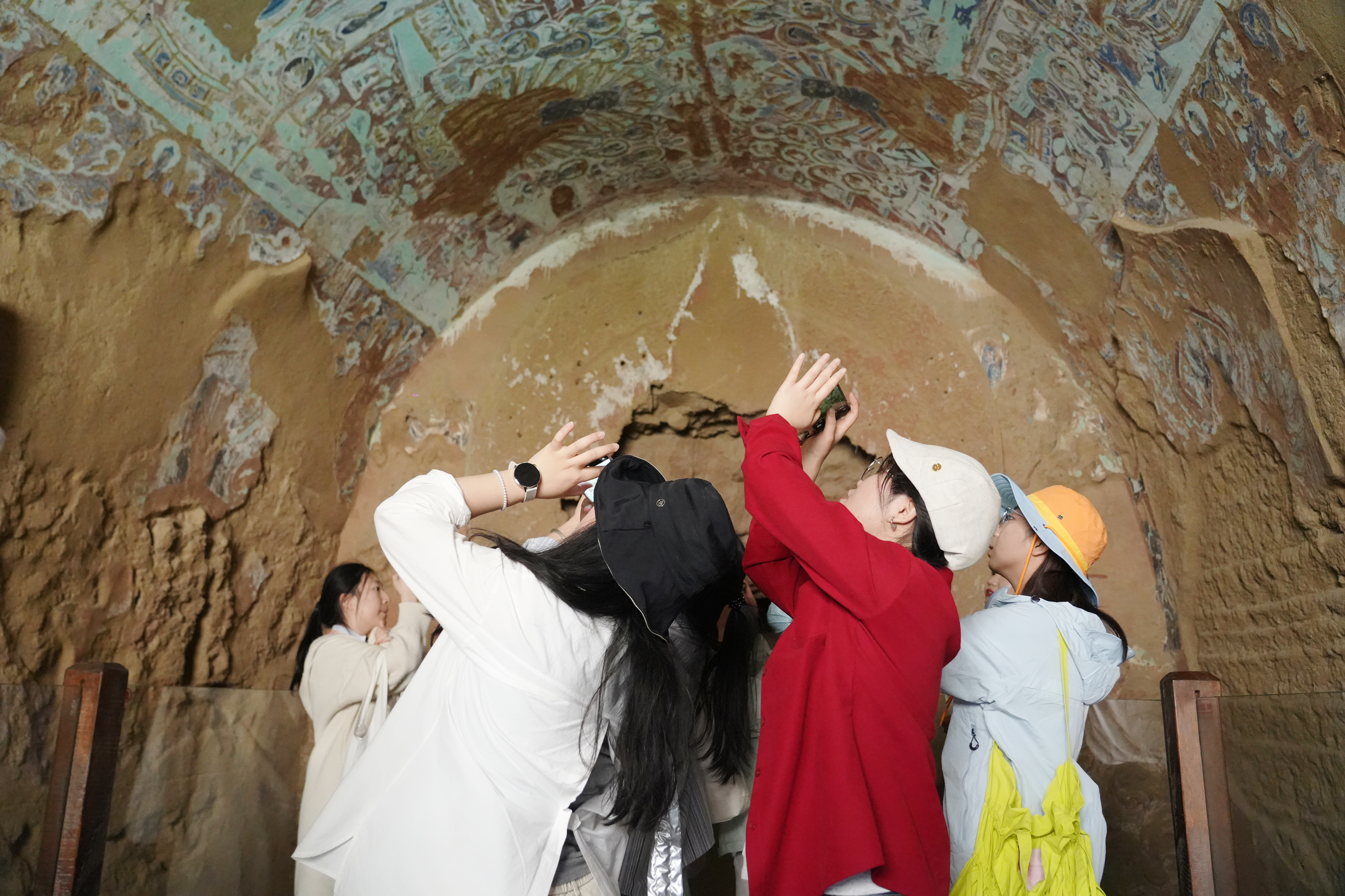 随后,大家前往全世界现存规模最大、延续时代最长、发展脉络最清晰的回鹘佛教代表性遗址——柏孜克里克千佛洞。走进洞窟,大家细致察看壁画保存状况,深入了解千佛洞的历史沿革、艺术特色及保护研究进展,在斑驳壁画中读懂古代民族的文化交融与艺术成就。