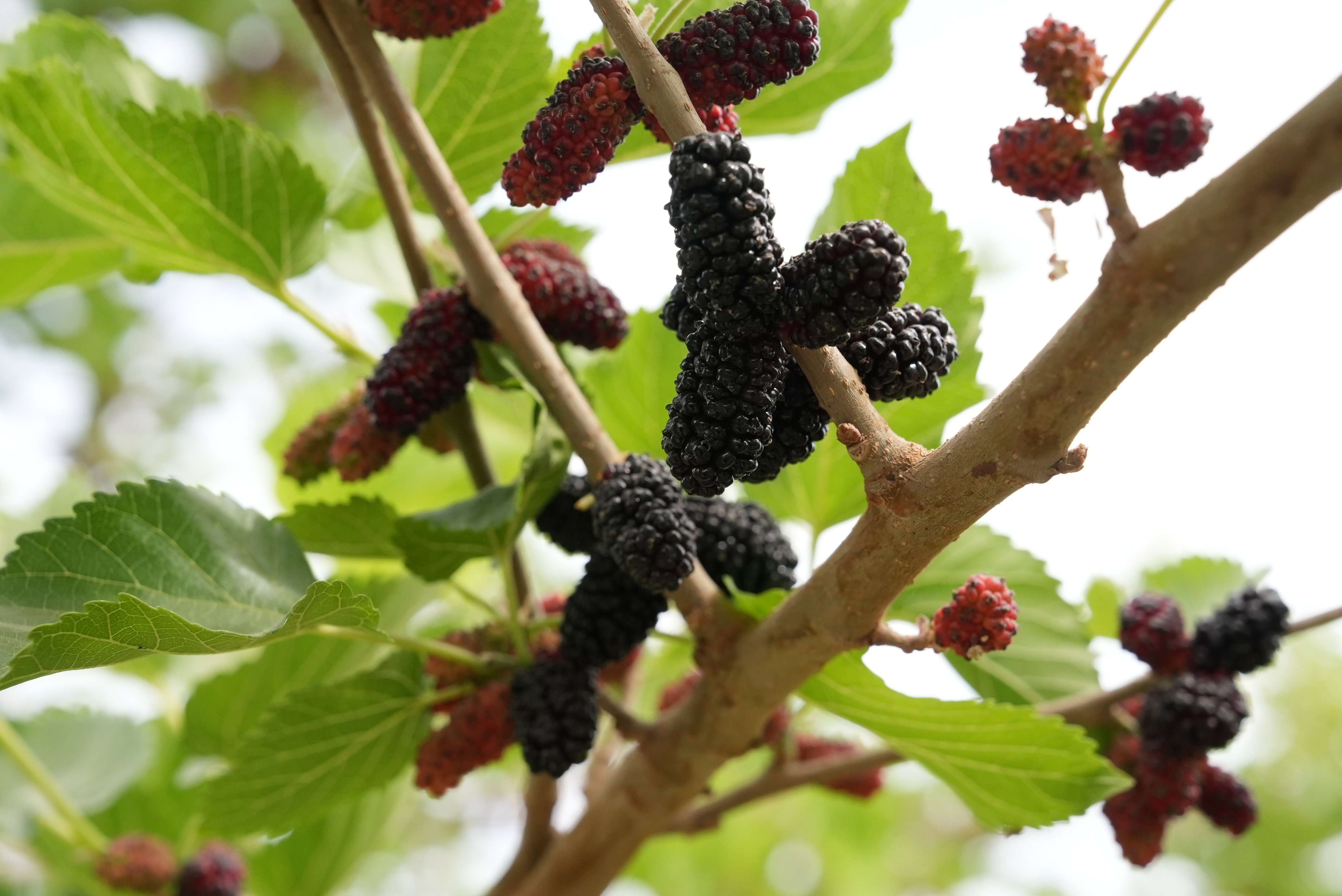 吐鲁番日照时间长、昼夜温差大、沙质土壤排水性好,加之天山雪水灌溉及悠久林果种植传统,为桑葚生长提供绝佳环境。产出的桑葚果形饱满、清甜多汁,花青素含量高,酸甜解渴,市场认可度高。目前全市桑树种植总面积5.5万余亩,其中结果面积2万余亩,产量约1900吨,品种涵盖药桑、黑桑、白桑、粉桑、黑妞等,另有5000余亩为新品种嫁接桑葚。