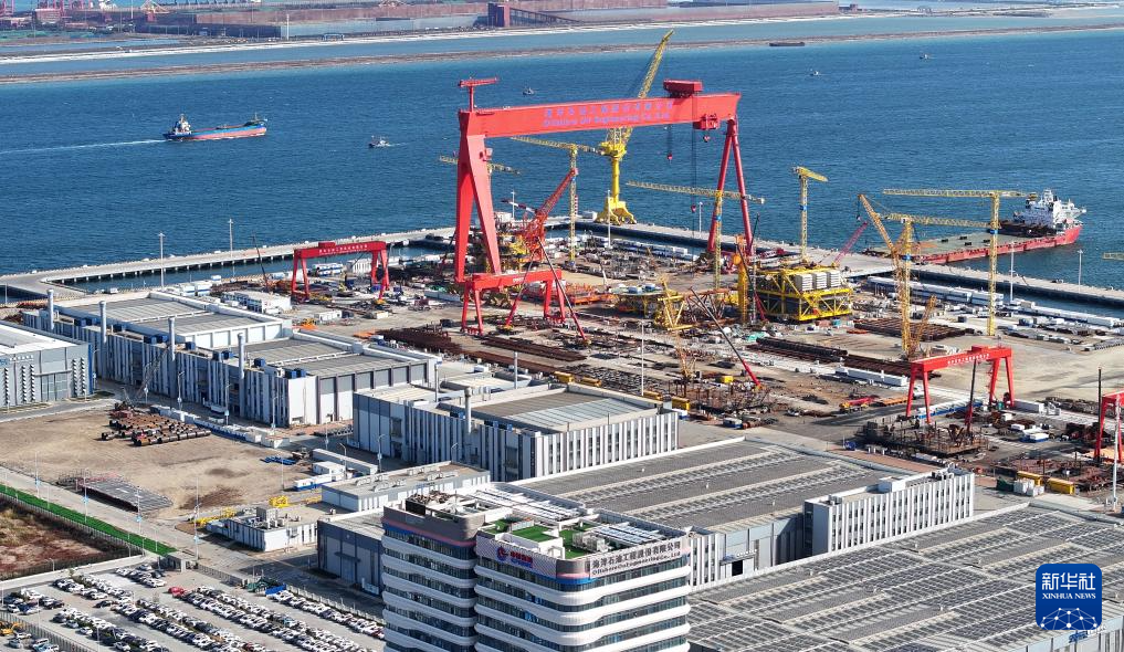 这是10月30日拍摄的海油工程天津智能制造基地(无人机照片)。当日,海油工程天津智能制造基地二期工程在天津滨海新区正式投产,标志着国内首个海洋油气装备“智能工厂”全面建成。海油工程天津智能制造基地占地面积约57.5万平方米,分两期进行建设,一期工程于2022年6月投入运营,二期工程于2023年7月开工建设。二期工程投产后,基地4个智能生产车间、8个生产辅助中心、16个总装工位及适合大型船舶停靠的码头等核心设施全面建成,生产能力可实现翻番。新华社记者 赵子硕 摄
