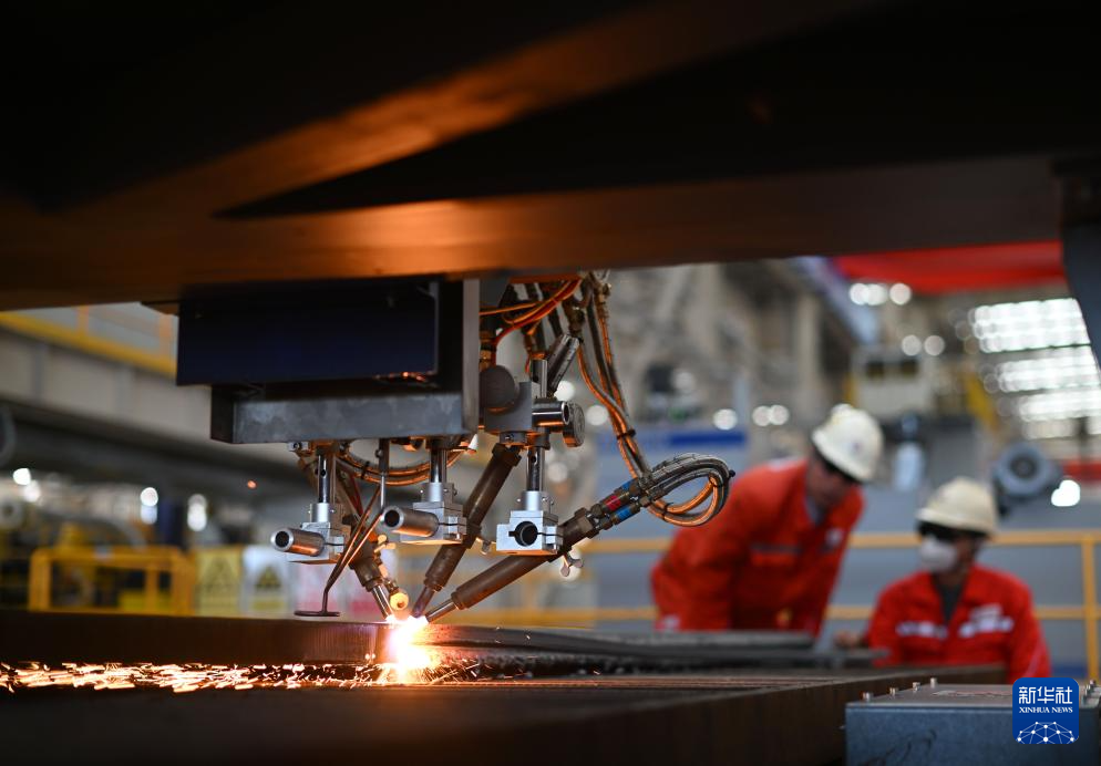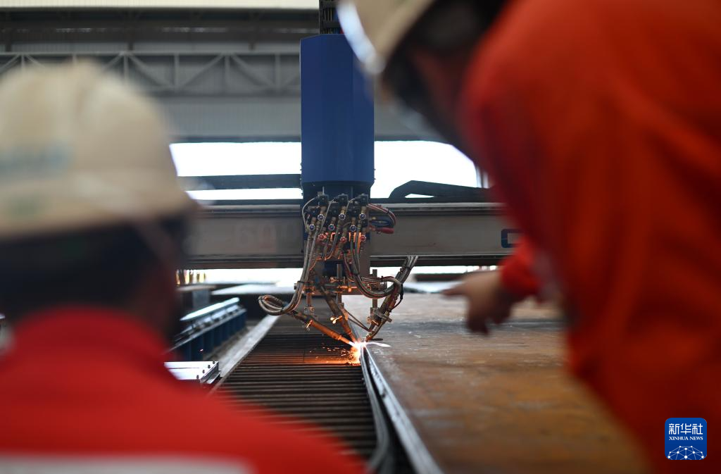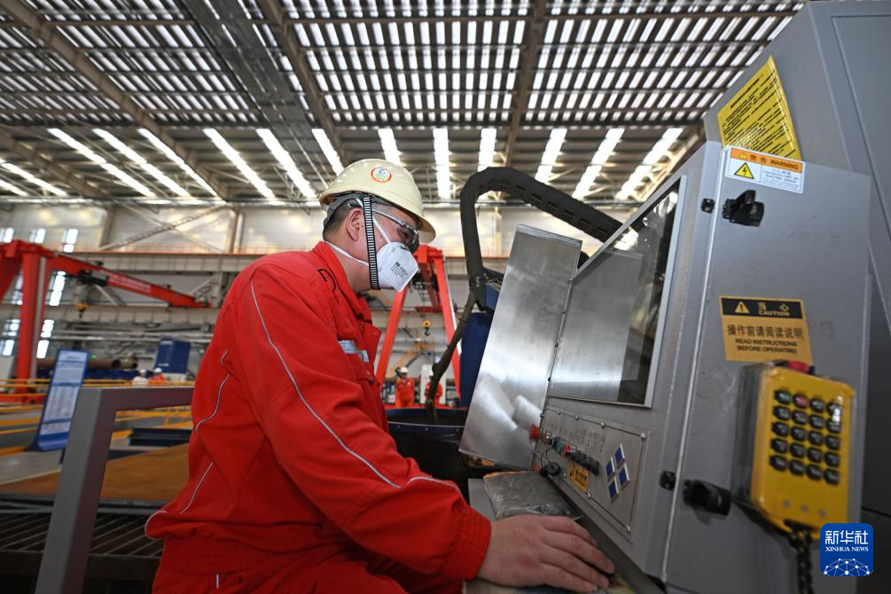 10月30日,工作人员在海油工程天津智能制造基地制管作业车间操作数控切板机。新华社记者 赵子硕 摄