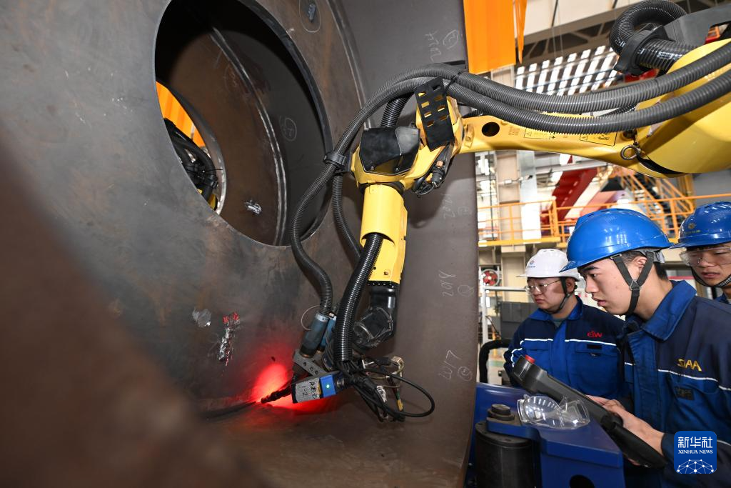10月30日,工作人员在海油工程天津智能制造基地制管作业车间维护一款智能焊接设备。新华社记者 赵子硕 摄