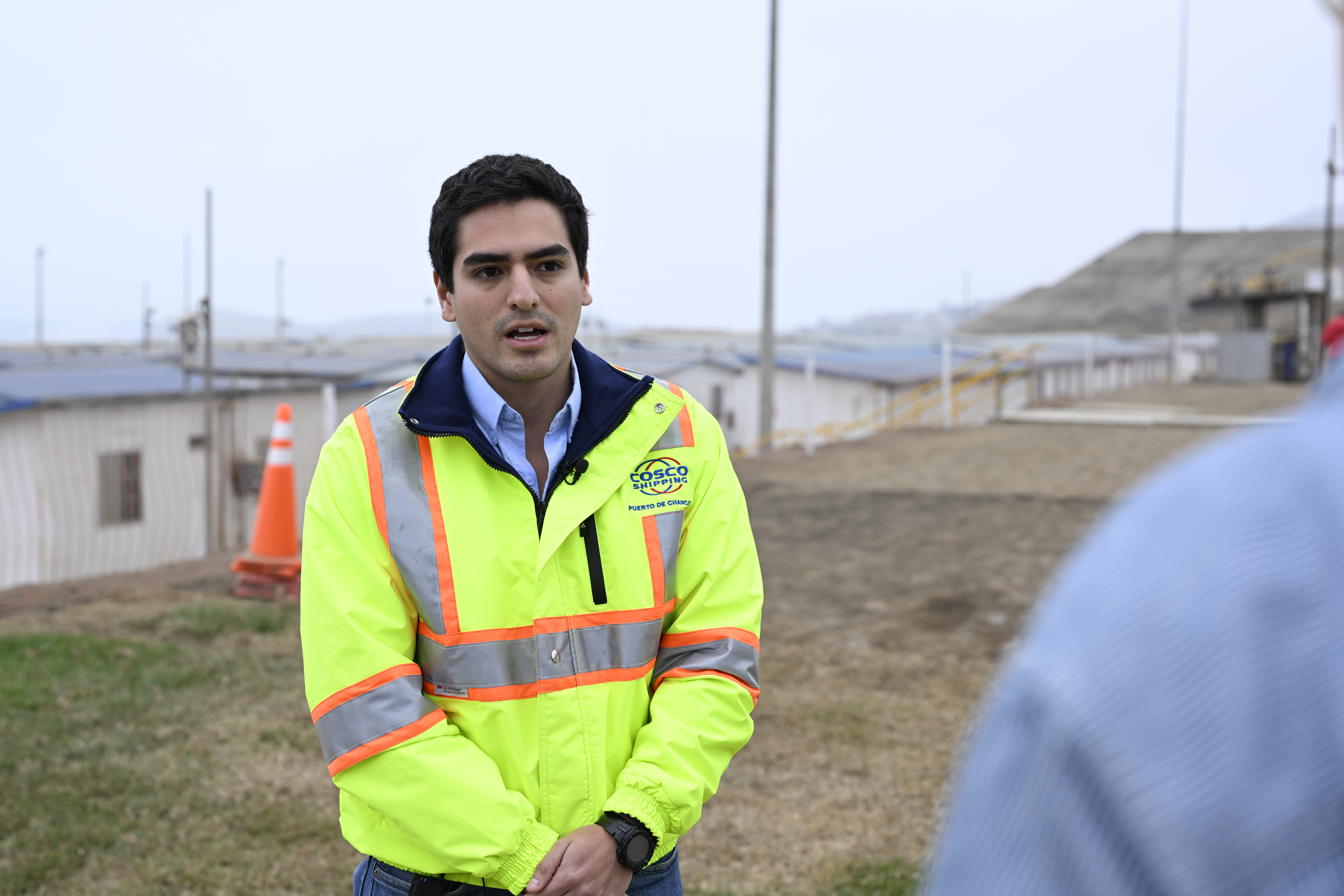 2024年6月21日,秘鲁青年丹尼尔·哈雷斯在钱凯港项目现场接受媒体采访。项目启动之初,丹尼尔·哈雷斯还是一名刚入职场的实习生,如今27岁的他已成长为项目工程部合同管理员。随着钱凯港建设不断推进,项目的工作岗位在当地成为年轻人就业的热门选项。