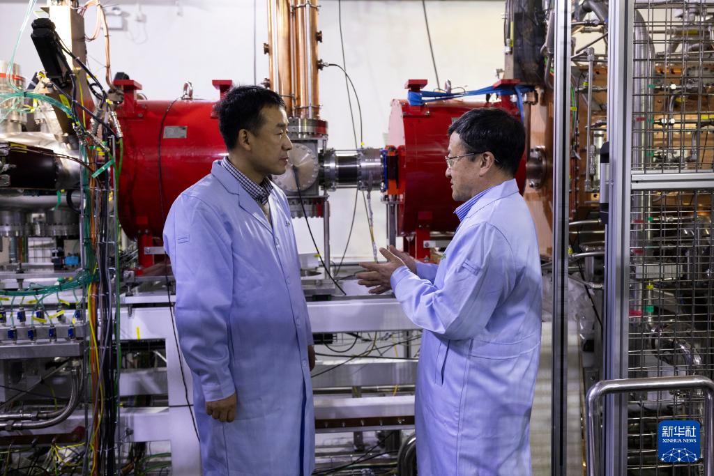 12月10日,项目总负责人、中国科学院院士赵红卫(右)和超导离子源研制负责人、中国科学院近代物理研究所加速器技术中心副主任孙良亭研究员在低能量强流高电荷态重离子研究装置前讨论实验进展。新华社记者 金立旺 摄