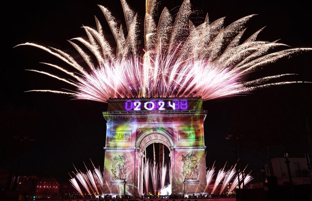 2024年1月1日,法国巴黎凯旋门上空焰火绽放,迎接新年到来。