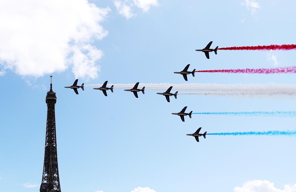 这是2021年8月8日,“法兰西巡逻兵”飞行表演队飞过埃菲尔铁塔。当日,东京奥运会闭幕式上举行了会旗交接仪式,巴黎2024奥组委与巴黎市政府在巴黎地标性建筑埃菲尔铁塔前举行庆祝仪式。