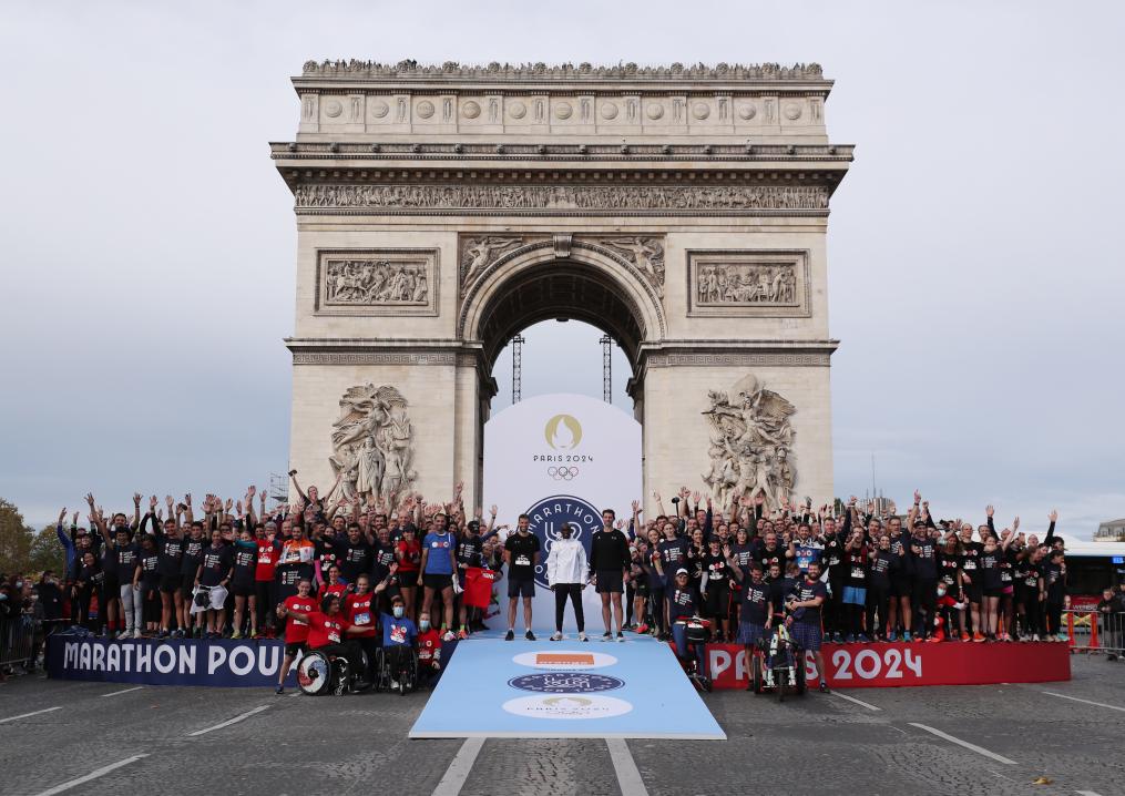 2021年10月31日,基普乔格(中)、巴黎奥组委主席埃斯坦盖(中,左)与参赛选手在比赛后合影。当日,为庆祝2024年巴黎奥运会倒计时1000天,法国巴黎香榭丽舍大街上举行了一场与男子马拉松世界纪录保持者基普乔格“赛跑”的全民马拉松5公里跑比赛,超过3600名选手参赛,获胜者可以参加2024年巴黎奥运会马拉松大众组比赛。