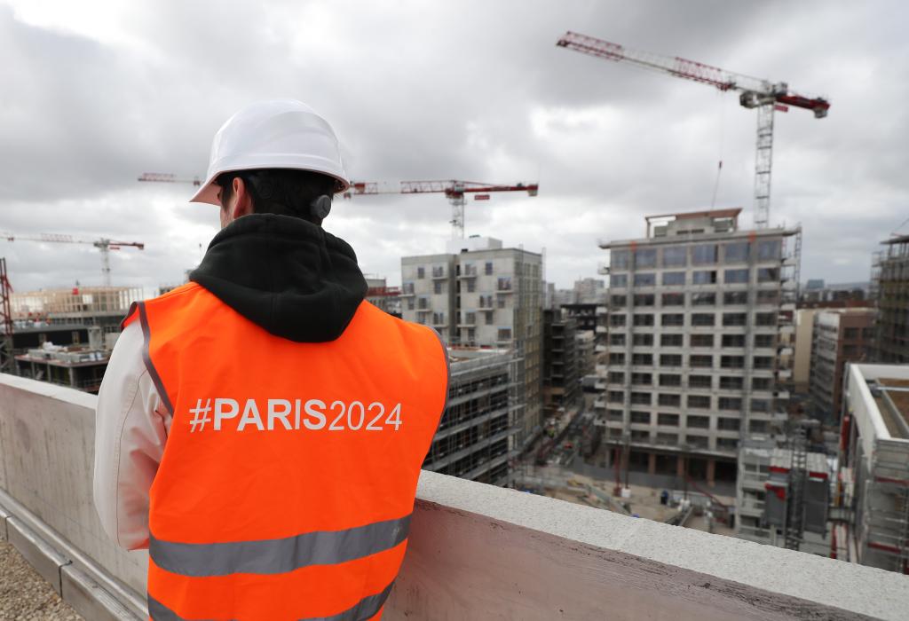 2023年3月24日,媒体记者在位于法国巴黎北郊圣但尼的巴黎2024年奥运会和残奥会运动员村建筑工地参观。