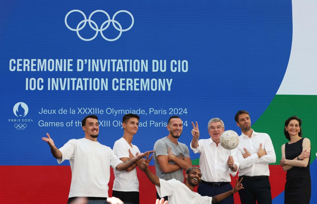 2023年7月26日,在位于法国巴黎北郊圣但尼的巴黎奥组委总部,国际奥委会主席巴赫(右三)、巴黎奥组委主席托尼·埃斯坦盖(右二)、法国体育部长卡斯特拉(右一)在庆祝仪式现场与街舞表演者互动。当日,在距离2024年巴黎奥运会正式开幕一周年之际,国际奥委会与巴黎奥组委在巴黎举行庆祝仪式。