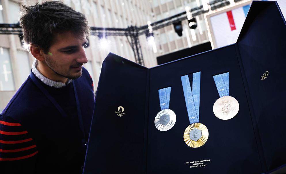 这是2024年2月8日,一名与会人员在发布仪式现场观看巴黎奥运会奖牌。当日,2024年巴黎奥运会及残奥会奖牌在巴黎奥组委总部正式亮相。此次奖牌的最大亮点在于,每一块奖牌中间,都镶嵌了一块取自于埃菲尔铁塔的原始建造材料。