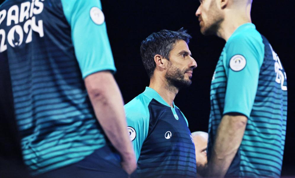 2024年3月23日,巴黎奥组委主席托尼·埃斯坦盖(中)身着志愿者制服出席巴黎奥运会志愿者大会。当日,巴黎奥运会志愿者大会在法国巴黎附近楠泰尔的拉德芳斯体育馆举行,巴黎奥运会志愿者制服在会上正式亮相。