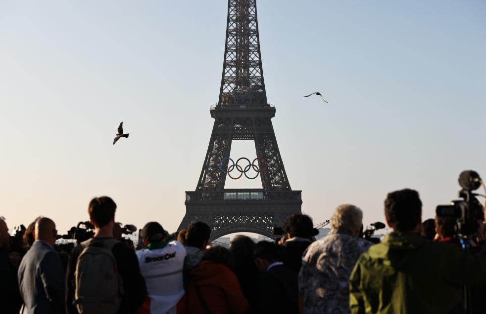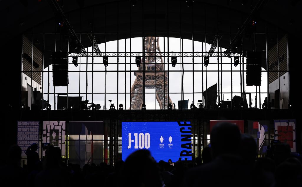 2024年4月17日,人们参加庆祝活动。当日,巴黎奥运会倒计时100天庆祝活动在法国巴黎埃菲尔铁塔附近的临时大皇宫举行。