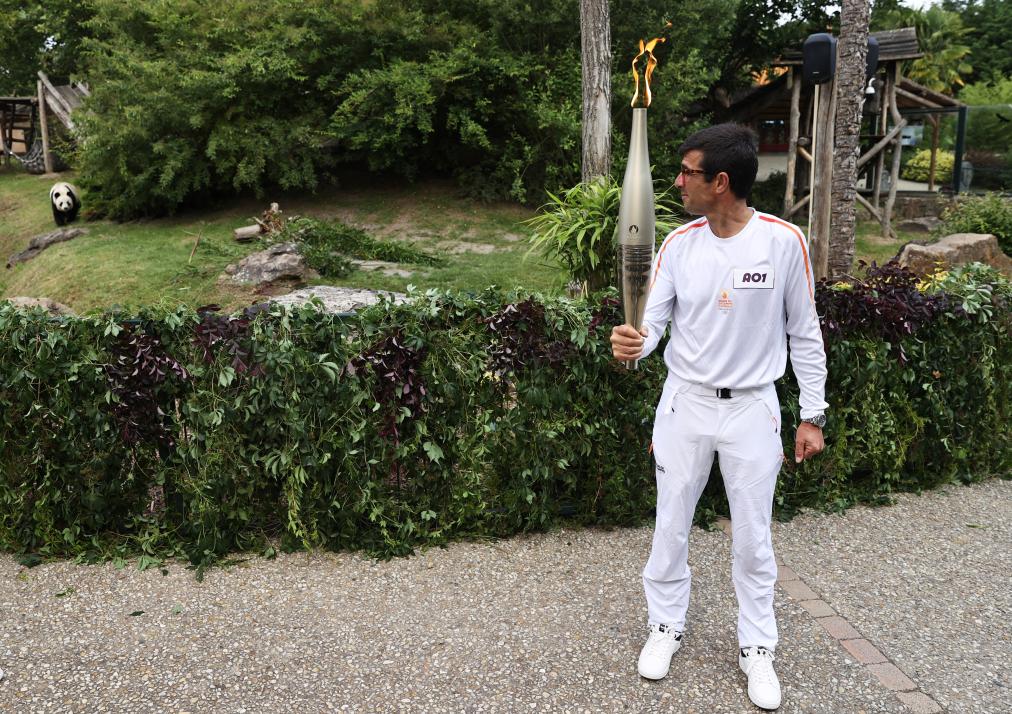 2024年7月8日,火炬手、博瓦勒野生动物园园长鲁道夫·德洛尔望着身后的旅法大熊猫“圆仔”。