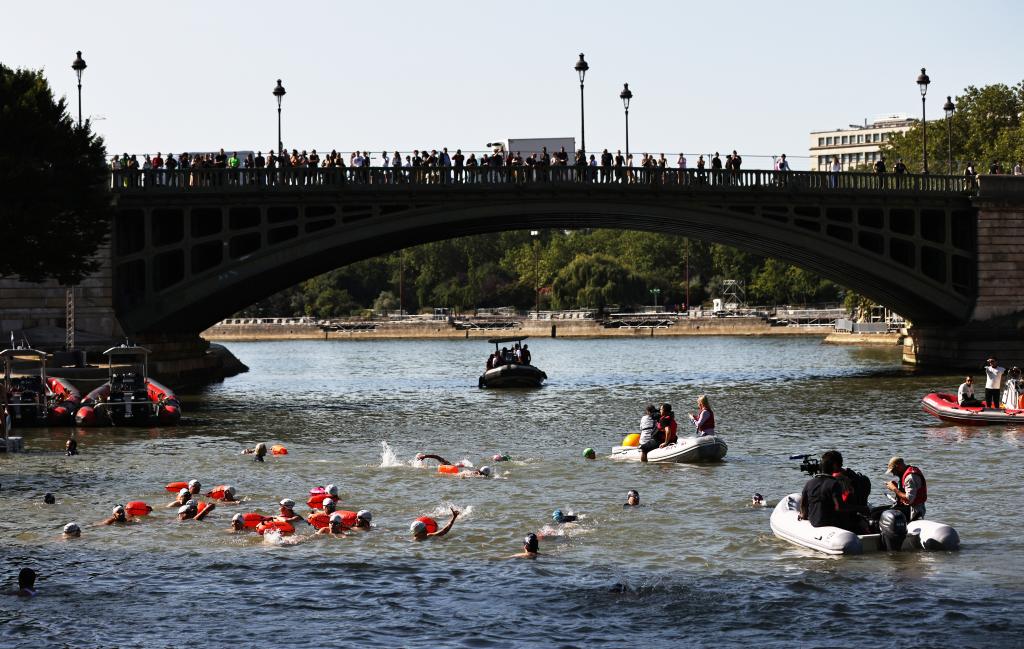 2024年7月17日,人们在塞纳河中游泳。距离巴黎奥运会开幕不到十天,巴黎市长伊达尔戈17日在塞纳河游泳,向外界展示几年来的河水净化成效。和伊达尔戈一起“畅游”的,还有巴黎奥组委主席埃斯坦盖等。