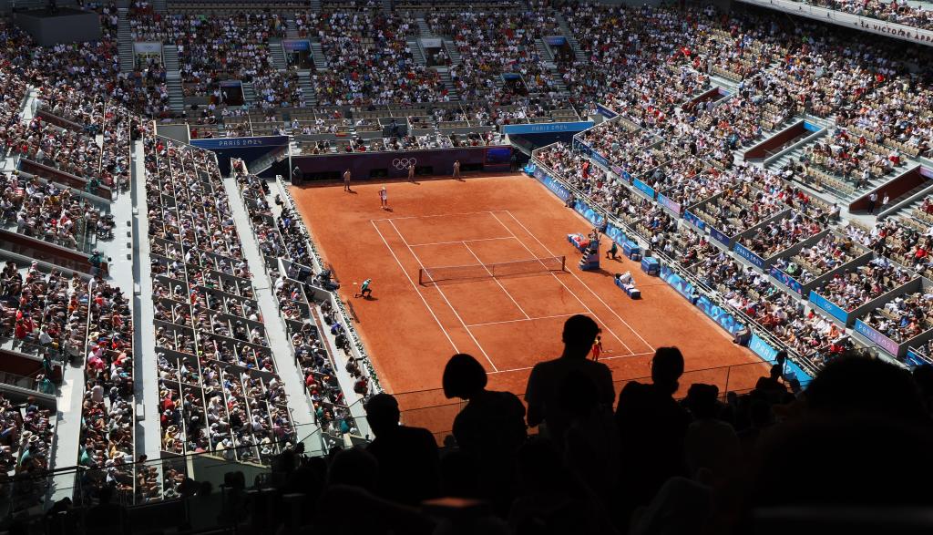 2024年8月1日拍摄的中国选手郑钦文和波兰选手斯维亚特克比赛现场。当日,在巴黎奥运会网球项目女子单打半决赛中,中国选手郑钦文2比0战胜波兰选手斯维亚特克,晋级决赛。