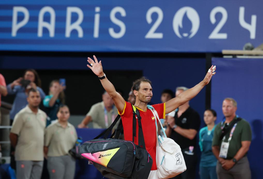 2024年7月31日,西班牙选手纳达尔(前)在比赛后离场。当日,在巴黎奥运会网球项目男子双打四分之一决赛中,西班牙组合纳达尔/阿尔卡拉斯0比2不敌美国组合克拉伊切克/拉姆,无缘四强。