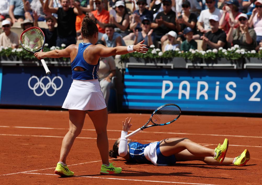 2024年8月2日,意大利组合埃拉尼/保利尼庆祝胜利。当日,在巴黎奥运会网球女双半决赛中,意大利组合埃拉尼/保利尼2比0战胜捷克组合穆霍娃/诺斯科娃,挺进决赛。