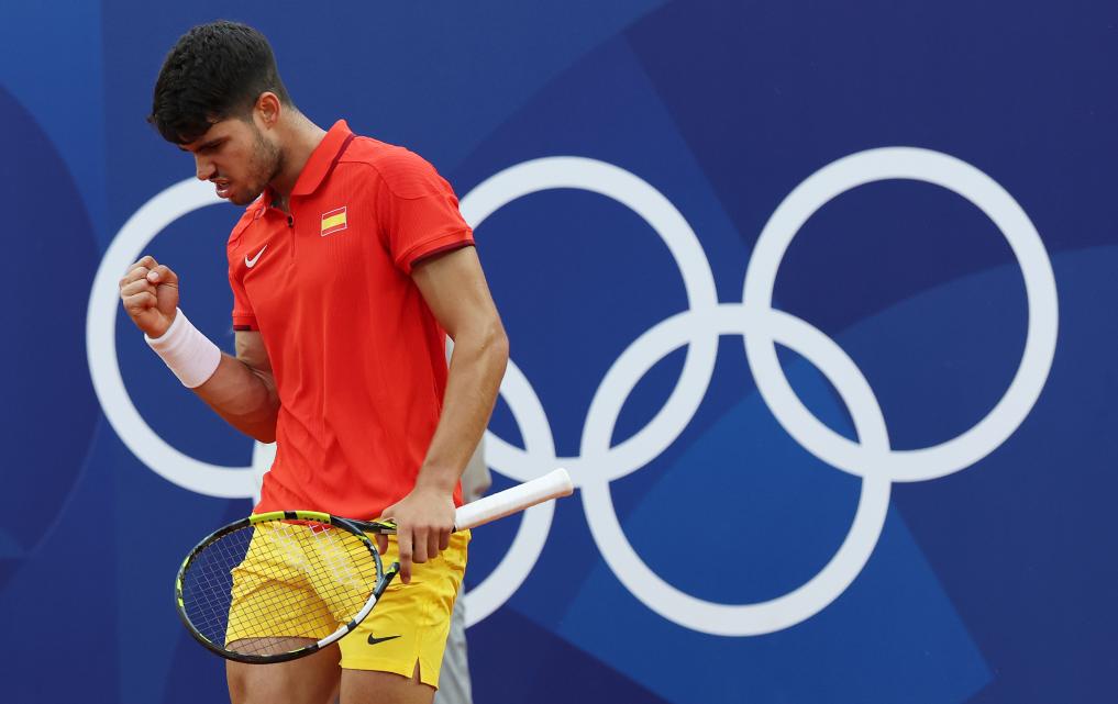 2024年7月27日,阿尔卡拉斯在比赛中庆祝得分。当日,在巴黎奥运会网球男单首轮比赛中,西班牙选手阿尔卡拉斯2比0战胜黎巴嫩选手哈迪,晋级第二轮。
