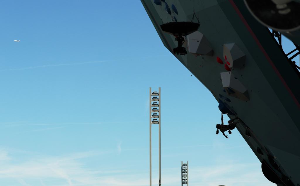 这是2024年8月10日,澳大利亚选手欧西安妮娅·麦肯齐在比赛中。当日,巴黎奥运会攀岩项目女子全能决赛在巴黎附近的勒布尔歇运动攀岩中心举行。