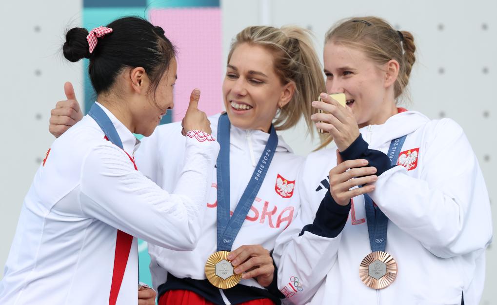 这是2024年8月7日,亚军中国选手邓丽娟(左)、冠军波兰选手米罗斯瓦夫(中)与季军波兰选手卡乌茨卡在颁奖仪式上。当日,在巴黎奥运会攀岩女子速度赛比赛中,中国选手邓丽娟获得银牌。