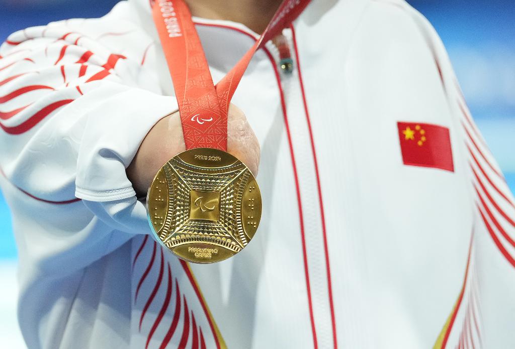 这是2024年9月3日,王金刚在颁奖仪式后展示奖牌。当日,在巴黎残奥会游泳男子50米蝶泳S6级决赛中,中国选手王金刚以31秒24的成绩获得冠军。