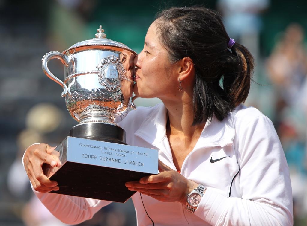 2011年6月4日,李娜在颁奖仪式上亲吻奖杯。当日,在2011年法网女单决赛中,中国选手李娜以2比0战胜意大利选手斯齐亚沃尼,夺得冠军。这是亚洲选手第一次夺得大满贯赛单打冠军。