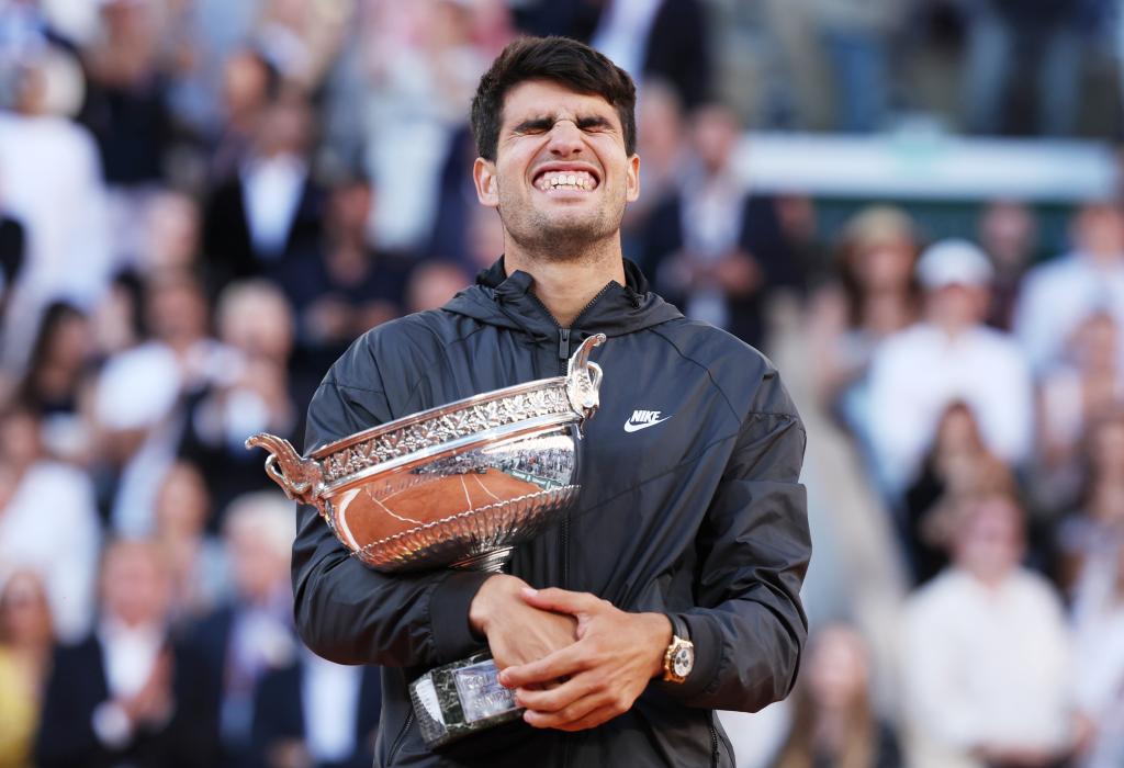 这是2024年6月9日,阿尔卡拉斯在颁奖仪式上庆祝。当日,在2024法国网球公开赛男子单打决赛中,西班牙选手阿尔卡拉斯3比2战胜德国选手兹维列夫,获得冠军。