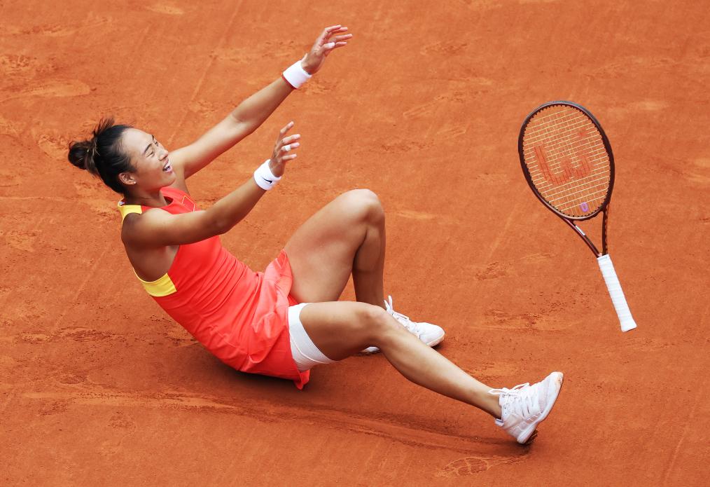 2024年8月3日,中国选手郑钦文在巴黎奥运会网球女子单打金牌赛后庆祝夺冠。