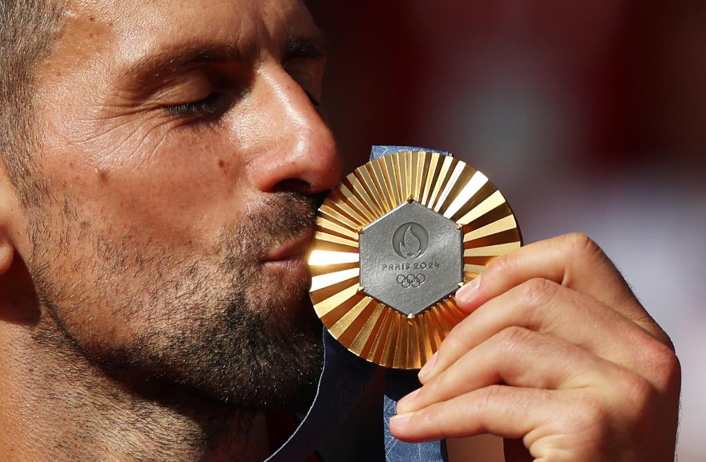 2024年8月4日,冠军焦科维奇在颁奖仪式上亲吻金牌。当日,巴黎奥运会网球项目男单决赛在罗兰·加洛斯体育场举行,塞尔维亚选手焦科维奇2比0战胜西班牙选手阿尔卡拉斯,获得冠军。