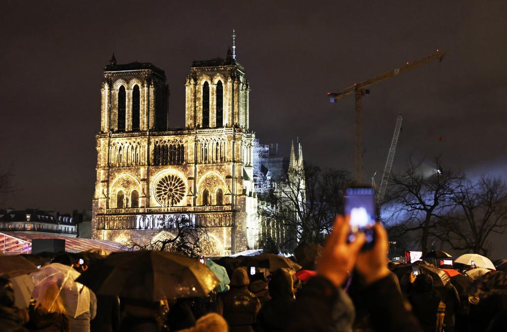 这是2024年12月7日,人们冒雨聚集在法国巴黎圣母院外,灯光在外墙上打出法语“谢谢”字样。