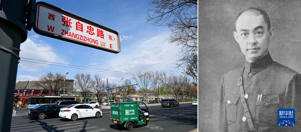 拼版照片:左图为北京市东城区张自忠路(新华社记者刘金海2025年3月27日摄);右图为张自忠像(资料照片)。
