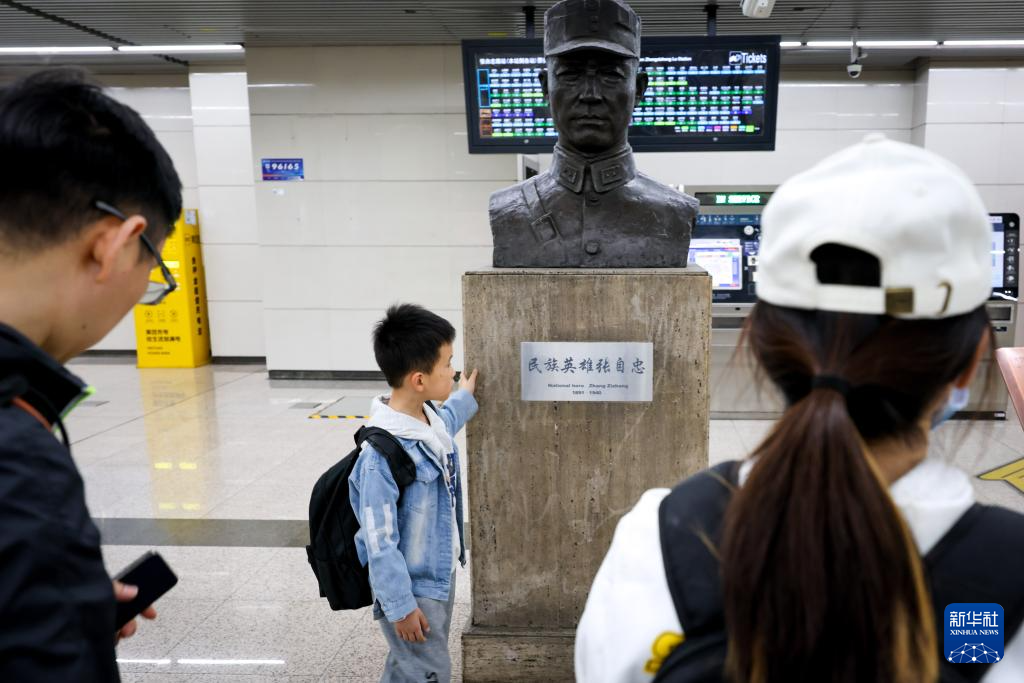 在北京地铁张自忠路站,乘客们瞻仰张自忠将军像(4月4日摄)。