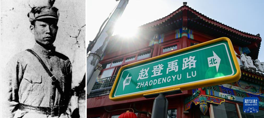 拼版照片:左图为赵登禹像(资料照片);右图为北京市西城区赵登禹路(新华社记者刘金海2025年3月26日摄)。