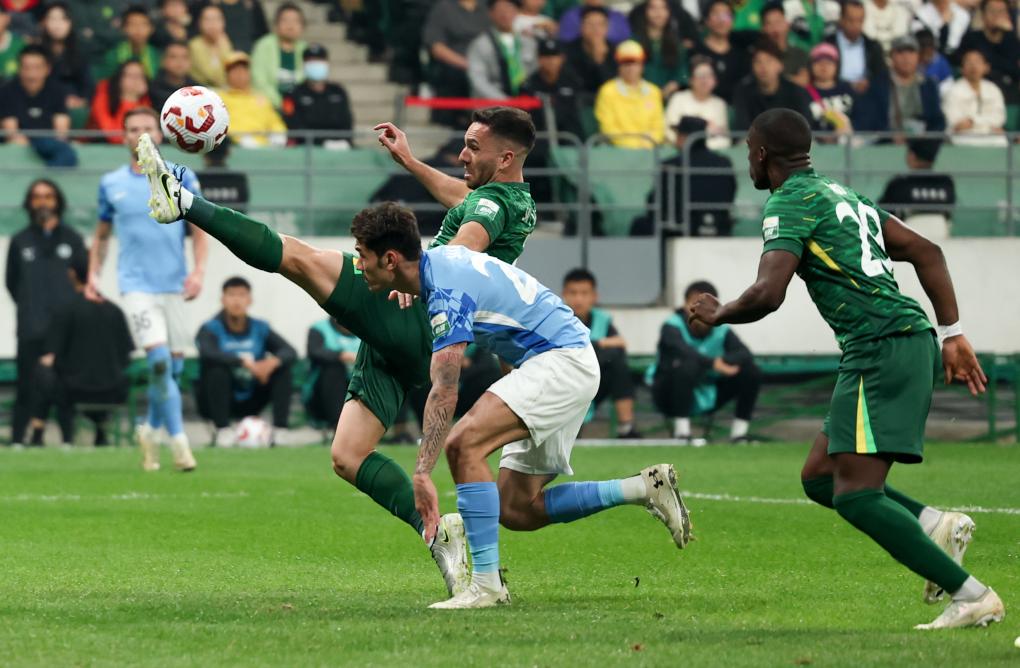 5月10日,北京国安队球员塞尔吉尼奥(左)在比赛中倒钩解围。新华社记者 王楷焱 摄