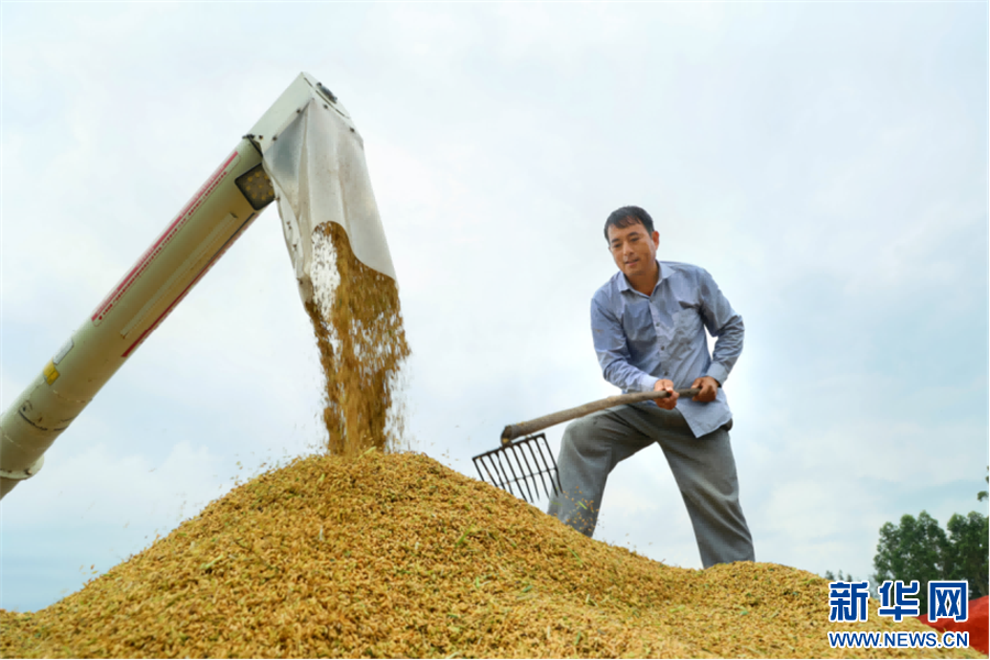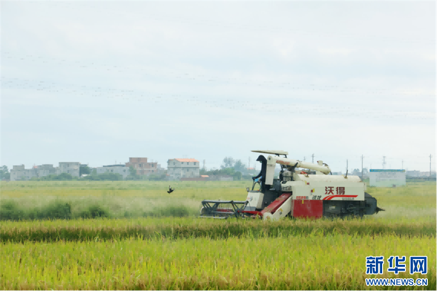 盛夏时节,广西东兴市千余亩早稻陆续进入成熟收割期。在福珍富硒水稻种植基地,金色的稻浪随风翻滚,收割机在田间来回穿梭,收割、脱粒、装车一气呵成,田间地头呈现繁忙的丰收景象。(甘立俊)